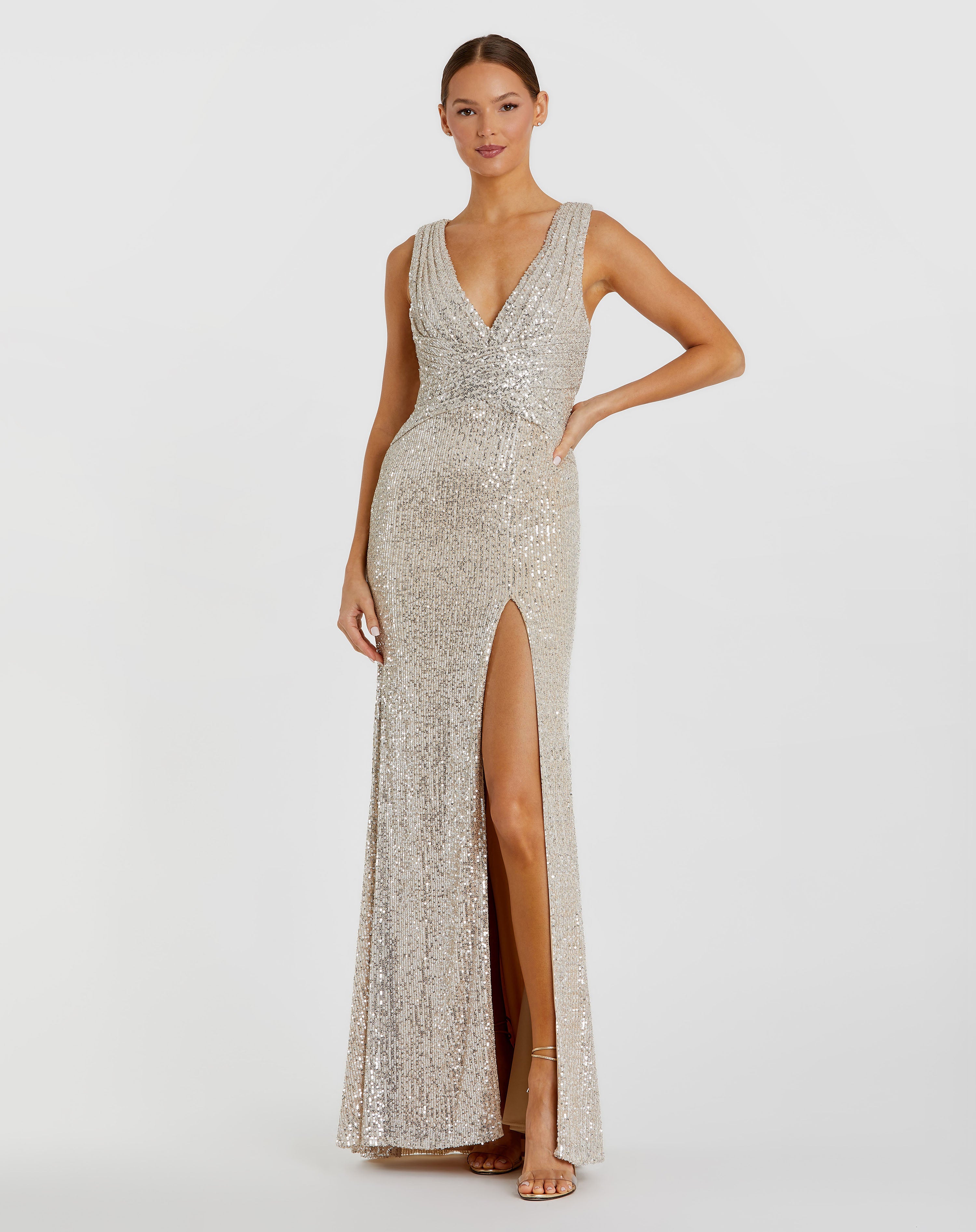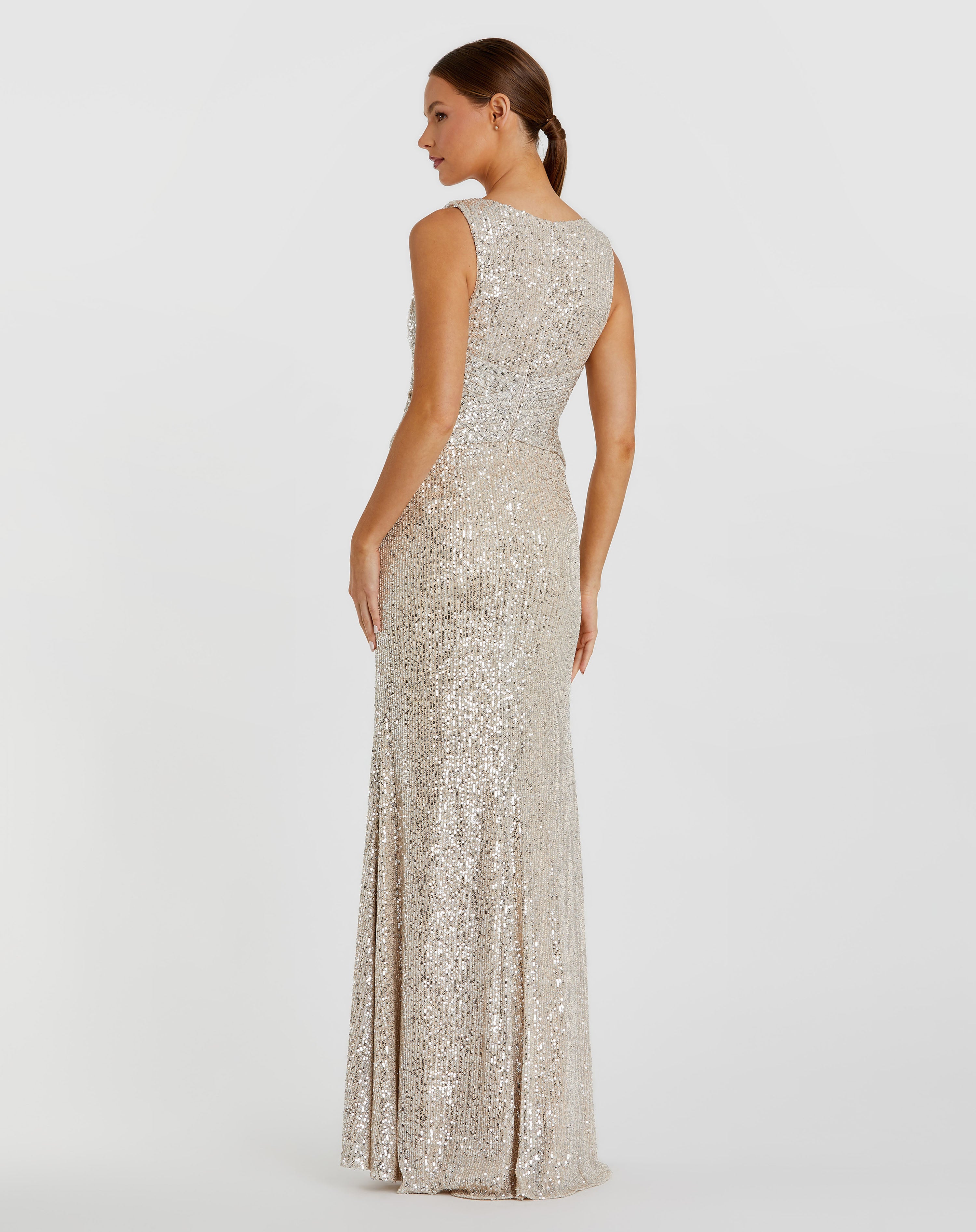 | Details: | Sleeveless, Sequin, Full Length, Slit, Wrap Waist, Full Back, Back Zipper |