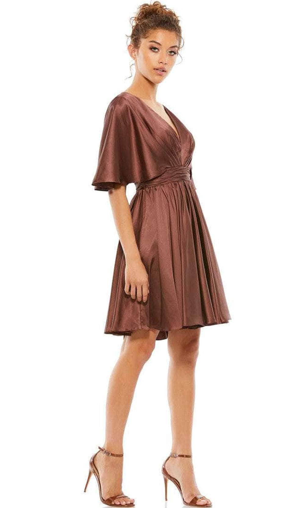 Show off your trendsetting style with this cocktail dress by Ieena Duggal 26605. This kimono style dress features a V-neckline with short ruffle sleeves. The A-line skirt features loose pleated details that extend all the way to the knees, allowing you to show off your sexy legs. Show off your bubbly and pleasant personality with this look by Ieena Duggal Couture. Exquisite attention to detail is the hallmark of Mac Duggal dresses. Mac Duggal dresses encapsulate the very essence of the women who wear them, reflecting their confidence, feminine power, and inner beauty. Models are wearing Berry, Chocolate, and White colors. Find more Short Prom Dresses.
