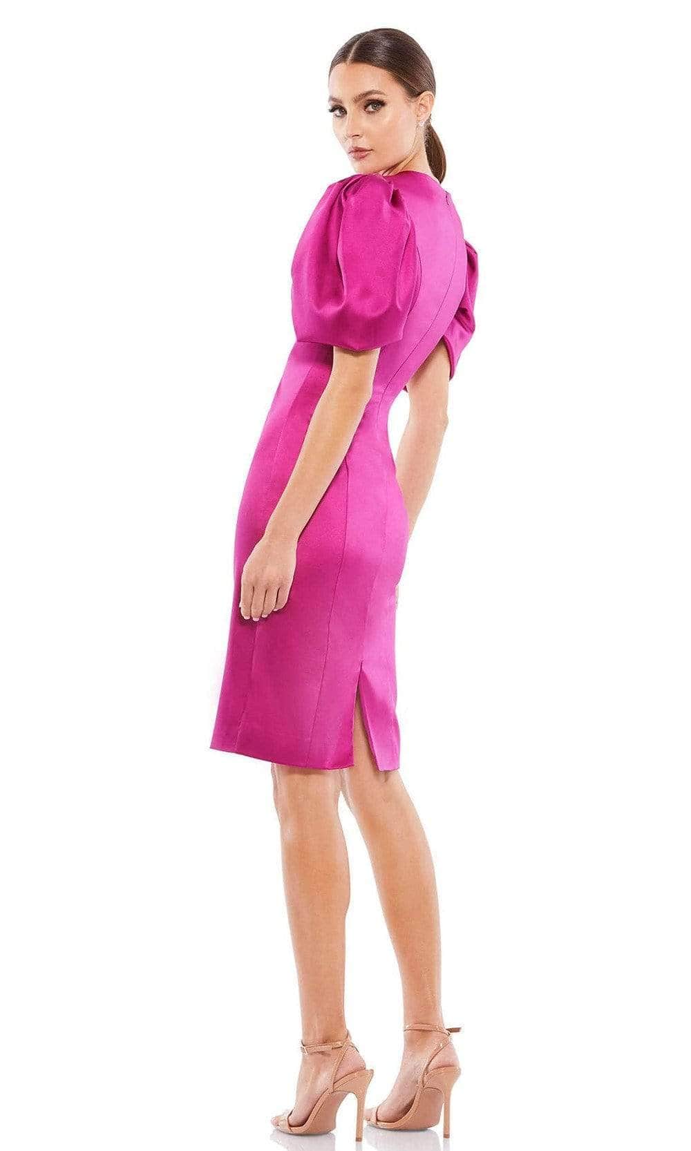 This Ieena Duggal 26636 dress gives you a feminine look fit for any special occasion. This fitted dress reveals a jewel neckline and framing puffed short sleeves, complemented with a zipped-up full back. The skirt parades a sheath silhouette that runs at knee length hem and has center back slit. This Ieena Duggal creation is truly remarkable!