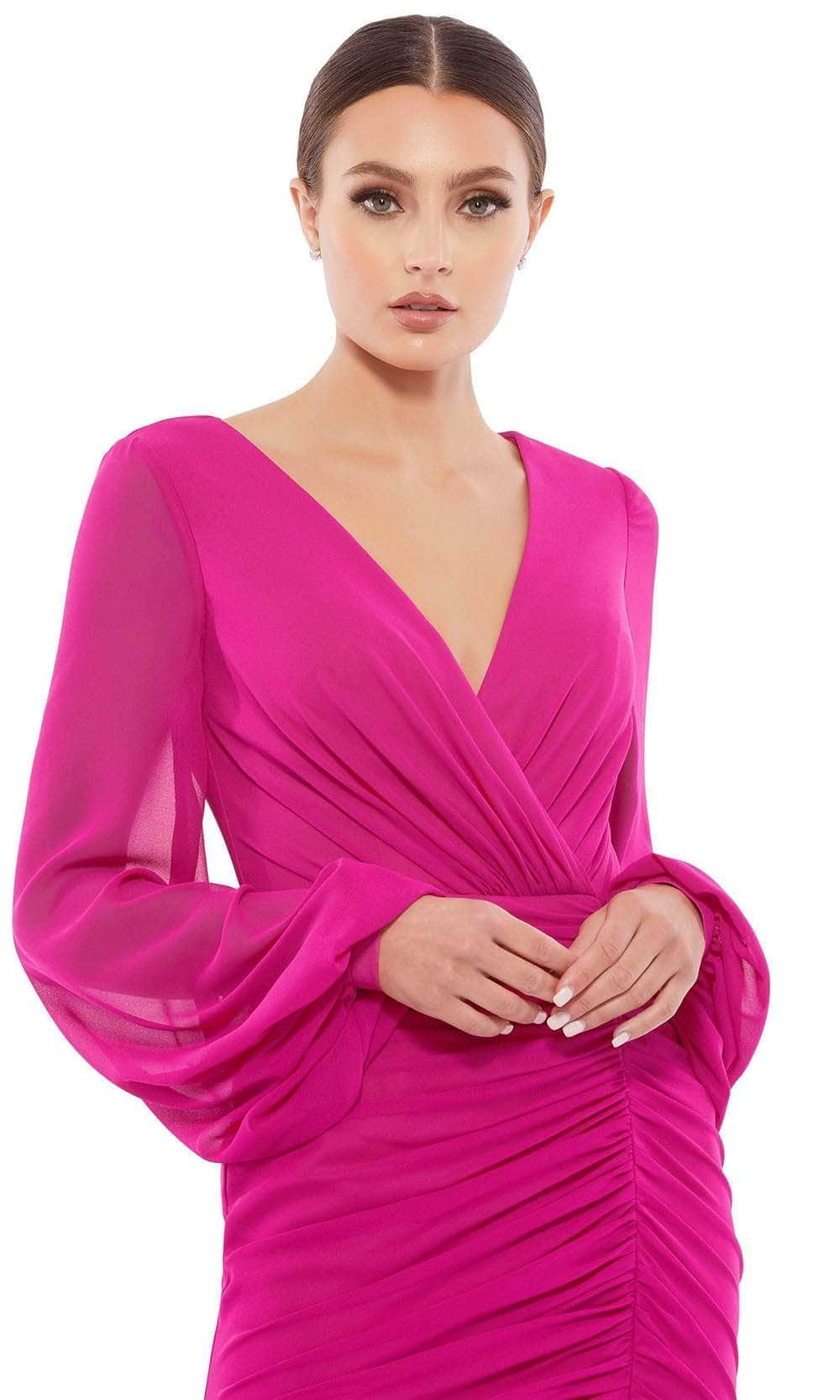 Reveal an elegance that is irresistibly feminine in this dress by Ieena Duggal 26655. With a surplice V-neck and sheer bishop sleeves, it has a fitted silhouette in luxurious chiffon. This tulip hemmed cocktail dress features fine ruching for a unique look. Showcase a memorable and sparkling glamour in this Ieena Duggal design. Exquisite attention to detail is the hallmark of Mac Duggal dresses. Mac Duggal dresses encapsulate the very essence of the women who wear them, reflecting their confidence, feminine power, and inner beauty. Models are wearing Hot Pink and White colors. Find more Homecoming Dresses.