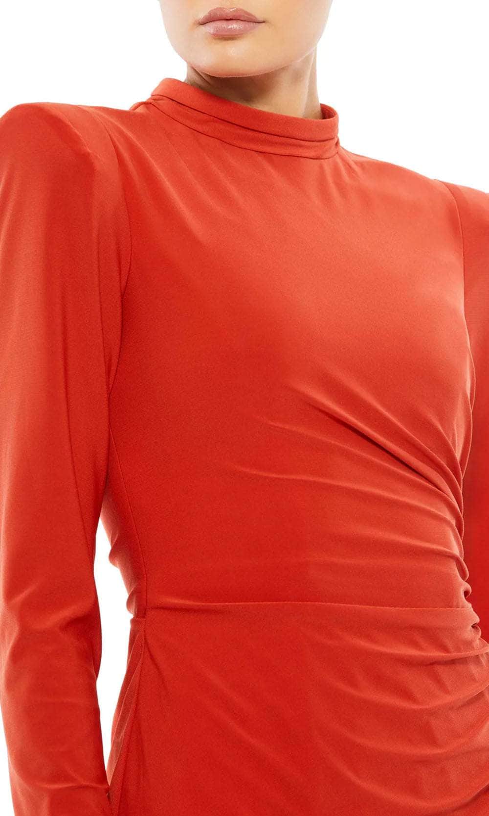 Be ready to capture the spirit of that romantic evening in Mac Duggal 26673 creation. This homecoming dress features a high neckline that perfectly matches the long sleeves. The whole garment has ruching details on its bodice to accentuate your waist and drape detail at one side, and it is closed with a back zipper closure. Leave everyone speechless when you enter the room in this Mac Duggal 26673. Model is wearing a Brick color.