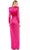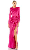 Embrace the fascinating style of this gorgeously sleek Mac Duggal 26676 creation. Sculpted with tailoring lines on a satin silhouette, this dress shows off with a structured bodice and shoulder on a jewel neckline bodice. Long sleeves frame the sleek bodice and the full back. Accented with an oversized bow, the sheath skirt showcases with a draped slit as it flows to the floor with flair. Regale a style that is alluring and romantic in this Mac Duggal masterpiece. Models are wearing the Olive and Magenta colors.