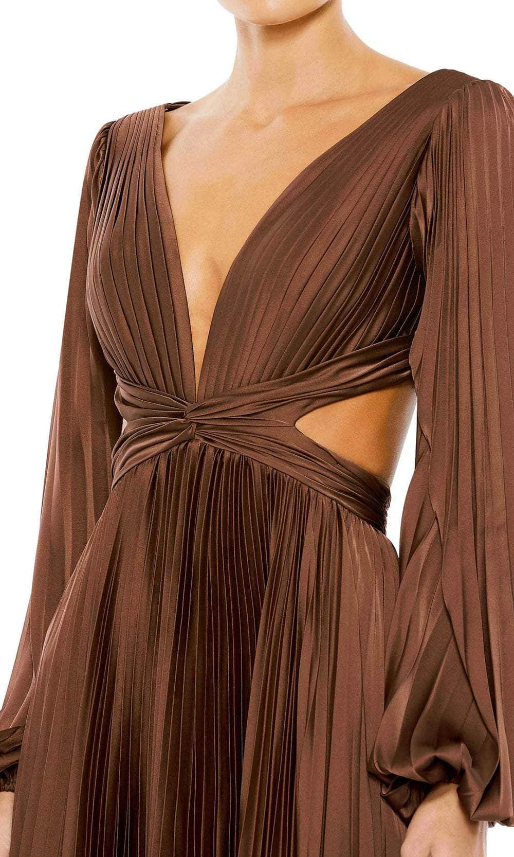 Every detail of this Leena Duggal 26737 gown is dripping with faultless charm! Captivate the crowd with its detailed pleated satin fabric with a gorgeous side cut out at the side of the bodice, emphasizing the inverted Basque waistline. Crowned with a V neckline and reveals an open back with straps that beautifully crisscross that reveal just enough skin to captivate everyone's attention. Look elegant in its skirt that flaunts an A-line silhouette and ends with a sweep train. This Leena Duggal 26737 evening gown will make you the party's darling! Models are wearing Espresso and Pink colors.