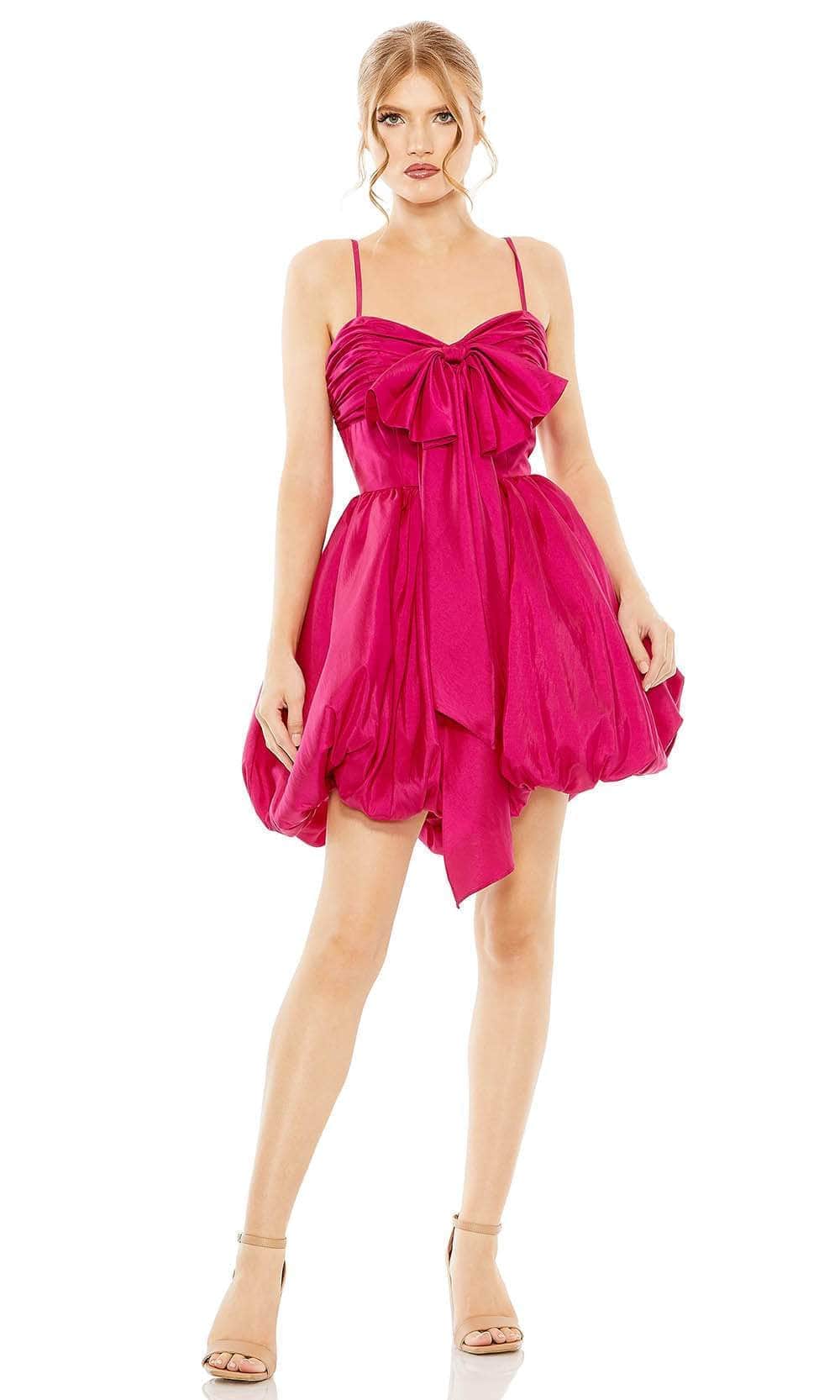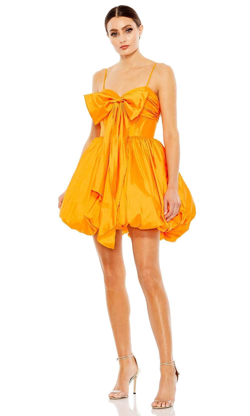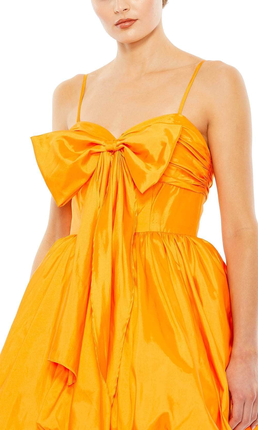 Lavish yourself by the utterly feminine Ieena Duggal 27040 creation at your stunning event. Exceptionally designed with a tailored silhouette rendered in sleek taffeta, this cocktail dress parades a sweetheart neckline trailing with spaghetti straps. Accented with ruching and an oversized bow, this beauty also features a midrise back with a zipper closure. Nipped at the waist, the skirt forms a voluminous balloon design with a mini hemline. Glow with the magnificence of royalty in this inspired Ieena Duggal 27040 masterpiece. Models are wearing the Black, Ice Blue, Orange, and Fuchsia colors.