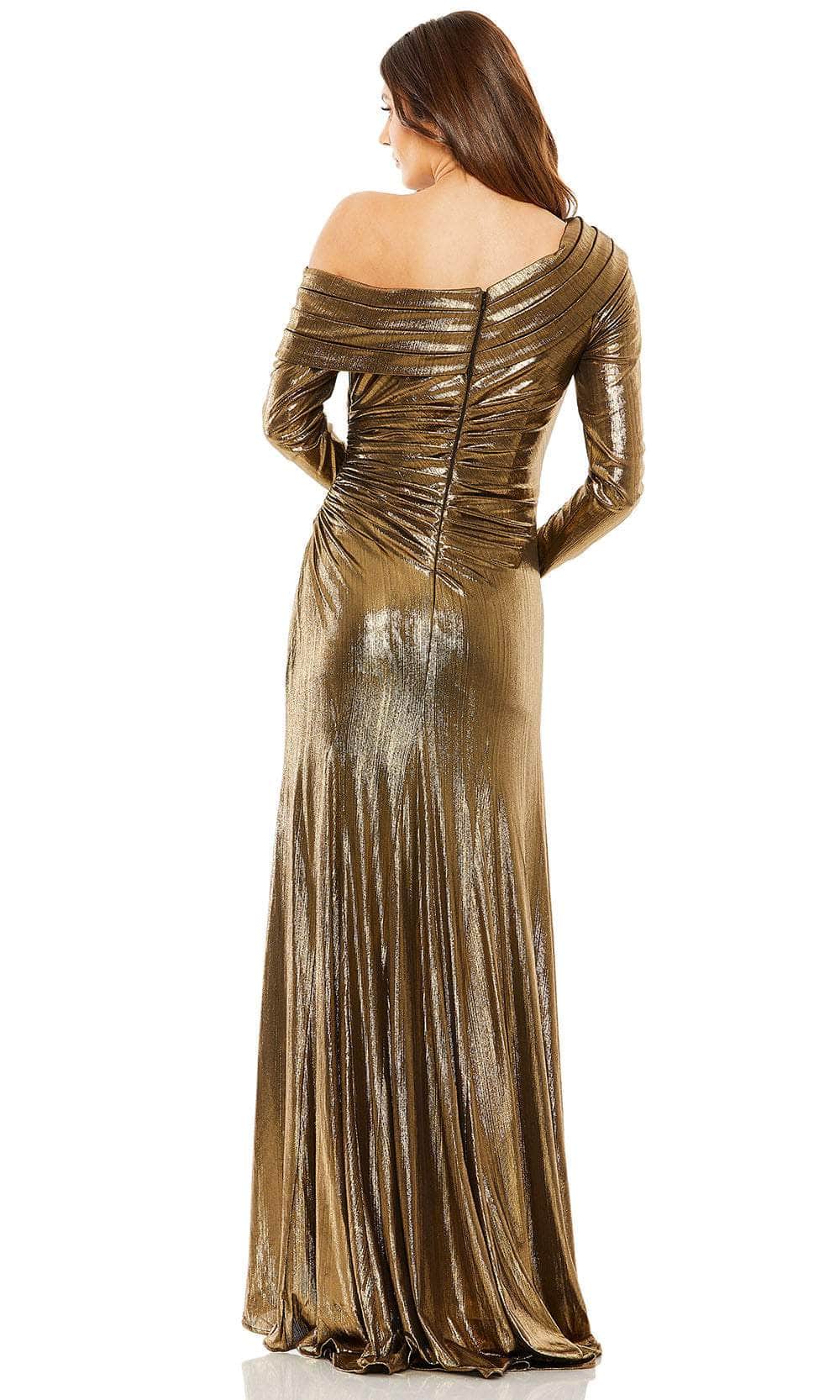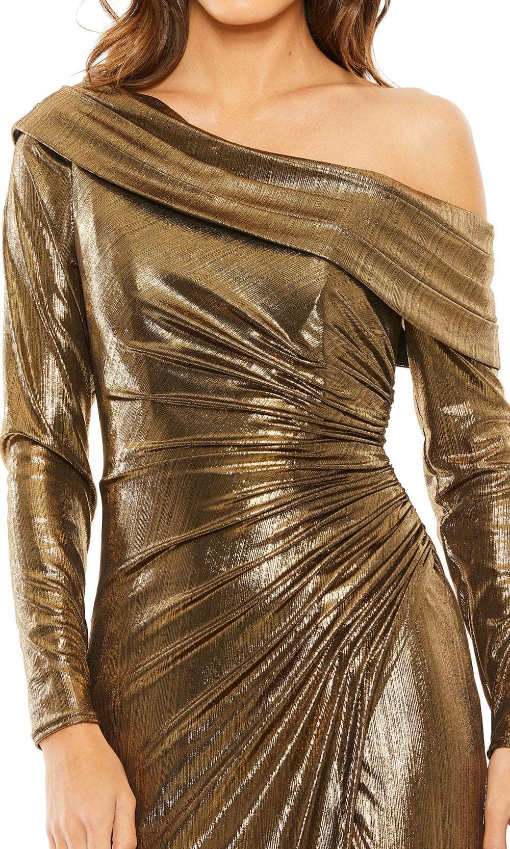 Make an incredible impression in this beautiful Ieena Duggal 27175 creation. Fashioned in stunning metallic fabric, this elegant piece features ruched details that heighten your curves and ensure a perfect fit. The top bodice consists of pleated folded detail with an asymmetrical neckline, long sleeves and a mid-open zippered back. With a thigh-high leg slit for a touch of drama, the wrap-style skirt reveals a sheath silhouette that beautifully streams to the sweeping train. You are statuesque in a posed gown from Ieena Duggal 27175. Model is wearing Antique Gold color.