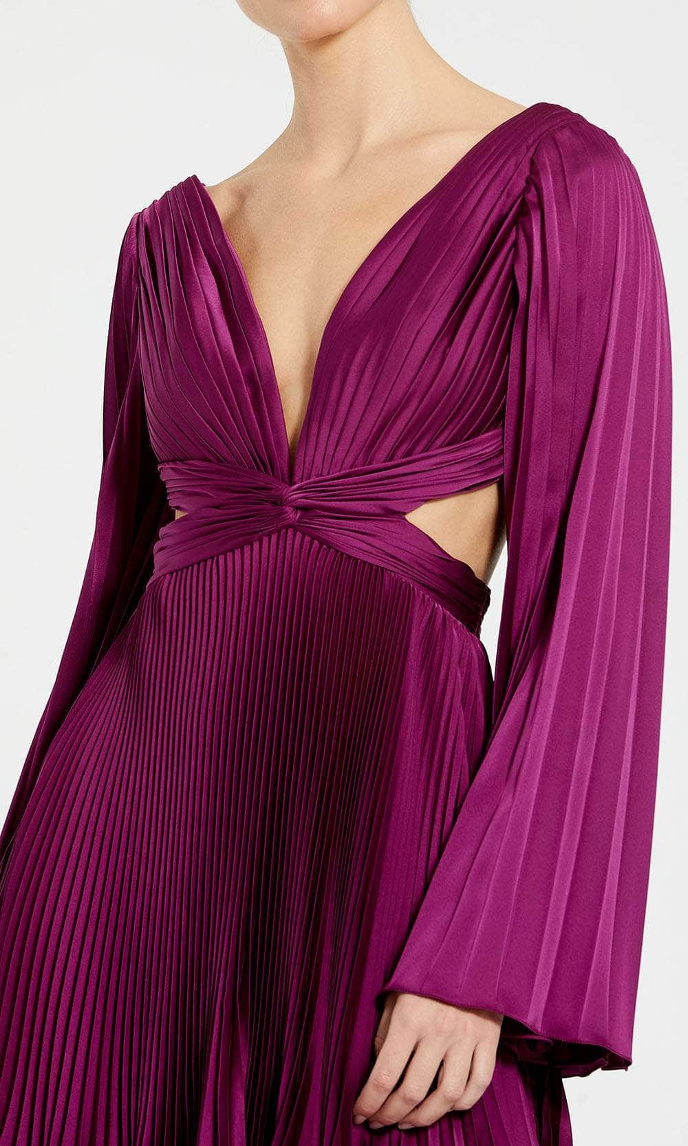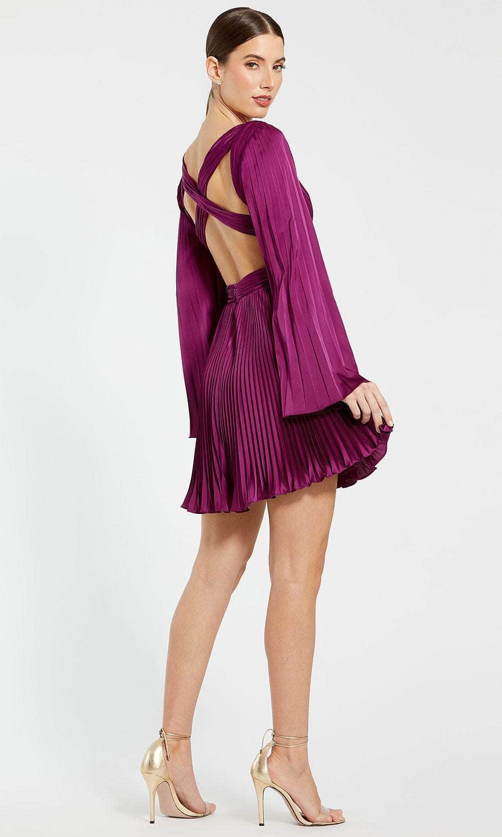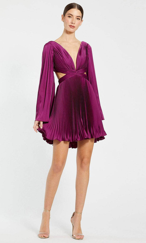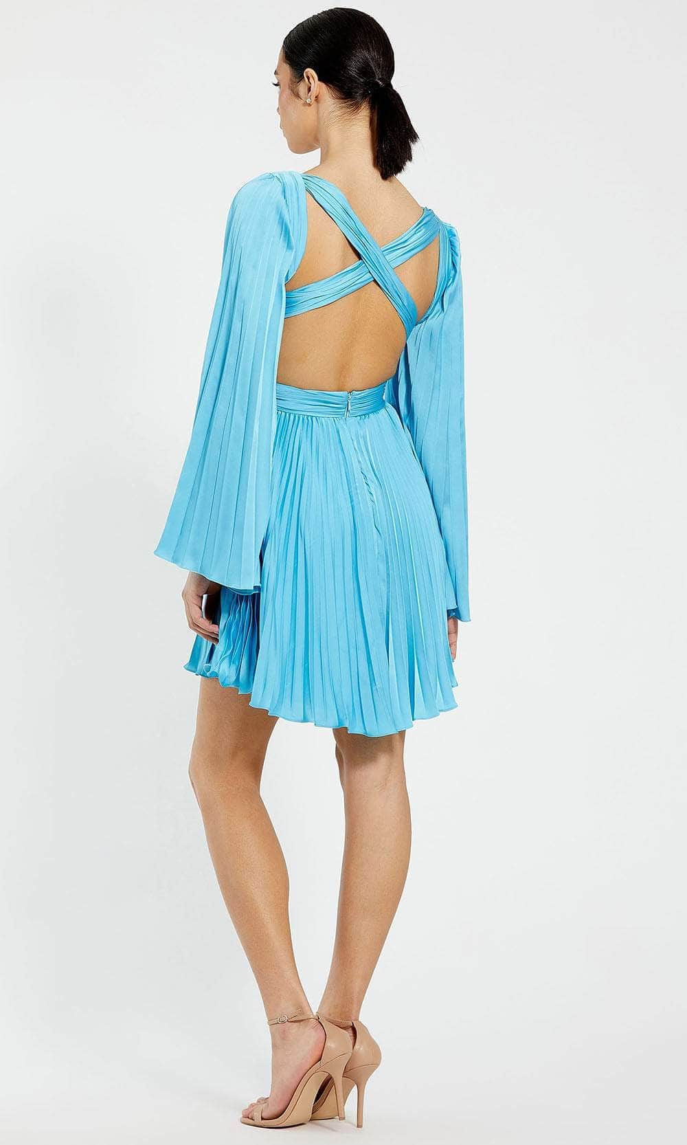 Orchestrate your moment to stand out in this simple yet captivating Mac Duggal 27379 cocktail dress. This short dress showcases an alluring plunging V-neckline on a top which also features side cut outs. It also exhibits long angel sleeves for support, also adding to its overall appeal. The back is in an open crisscross style, having a zipper closure on the skirt. This creation is designed with pleats, making it look classy. Additionally, an A-line silhouette is evident down to the mid-thigh length, showing ruffle designs along the hemline. Be beautiful in this fashionable evening with this Mac Duggal 27379 attire. Models are wearing Magenta, Turquoise, and White colors.