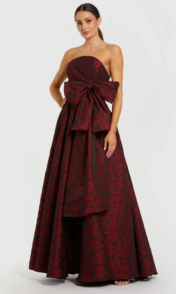 Make an unforgettable impression in the Ieena Duggal 27725, a gown that exudes sophistication from the very first glance. The dramatic oversized bow accents the strapless bodice, adding a playful yet refined focal point to this ballgown. The floral brocade pattern gives dimension and richness to the silhouette, making it perfect for a grand entrance. With its straight across neckline and full-length skirt, this style blends classic glamour with contemporary appeal. The Ieena Duggal 27725 is a striking choice for anyone who values both artistry and timeless beauty. Model is wearing Ruby color.