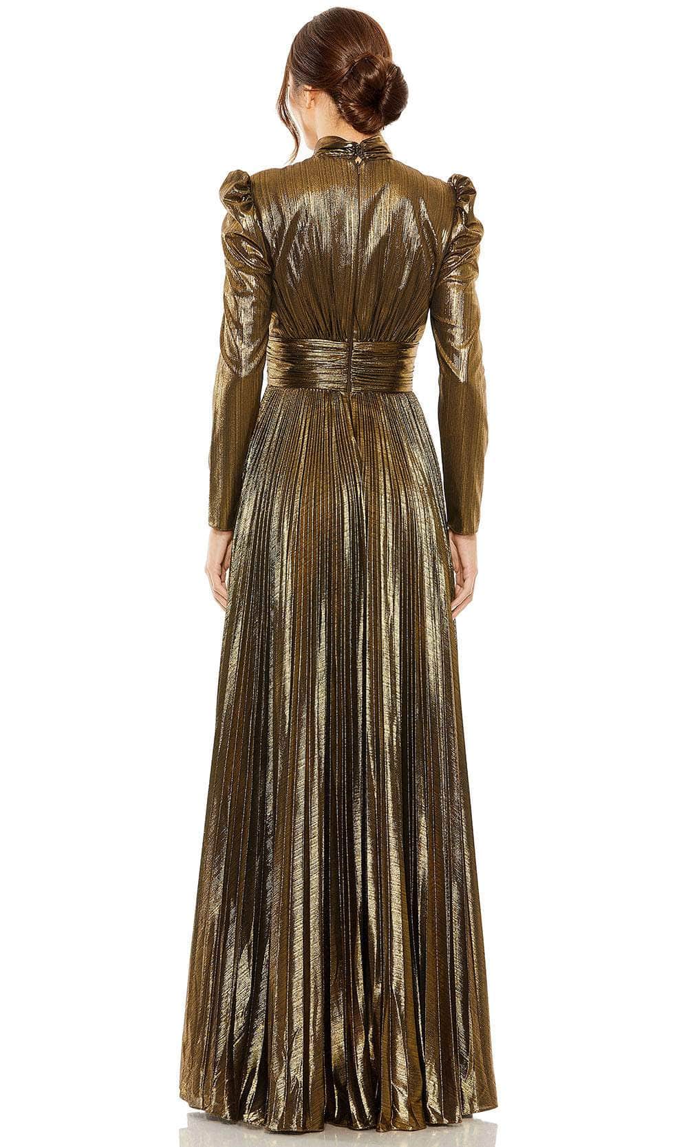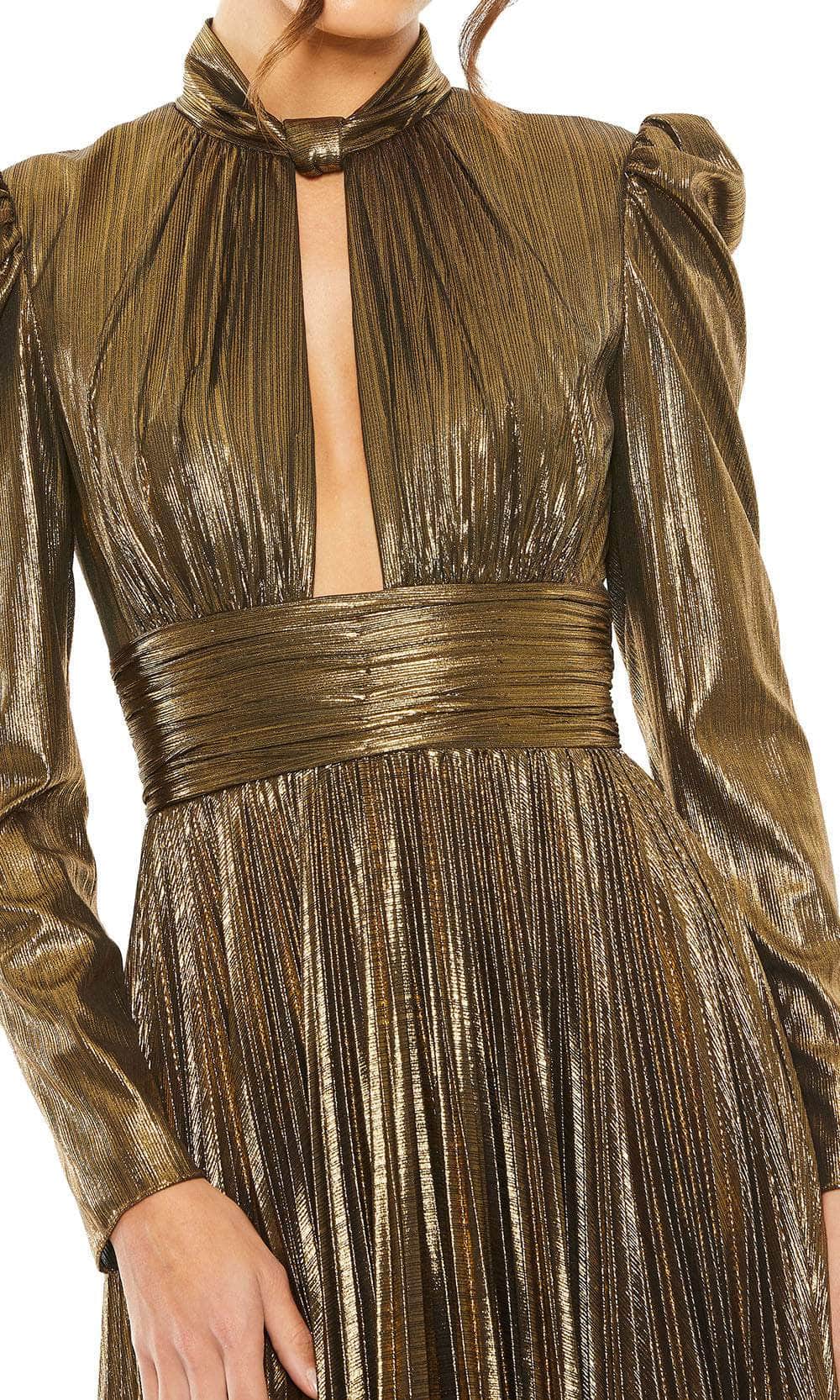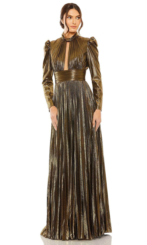 Make an impressive entrance in this luminous creation from Ieena Duggal 30758. This gown is an extravagant stunner with is metallic fabric and knotted detail in the high neckline. In addition, the keyhole cutout in the mid-bust and long puff sleeves adds glamour. The sophisticated back is fully covered with a clasp and zipper closure. To accentuate your figure, it has a ruched wide waistband. Carved in an A-line silhouette, the full length skirt is designed in accordion pleats for added style and volume. Clothe yourself in creative couture with this Ieena Duggal 30758 gown. Models are wearing Antique Gold, and Rose colors.