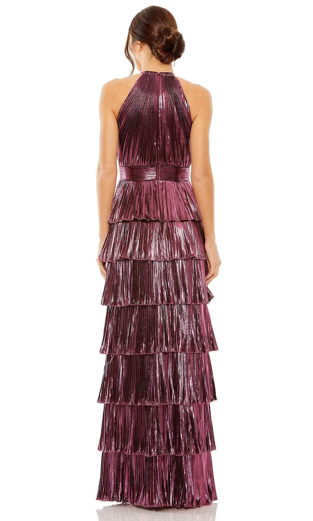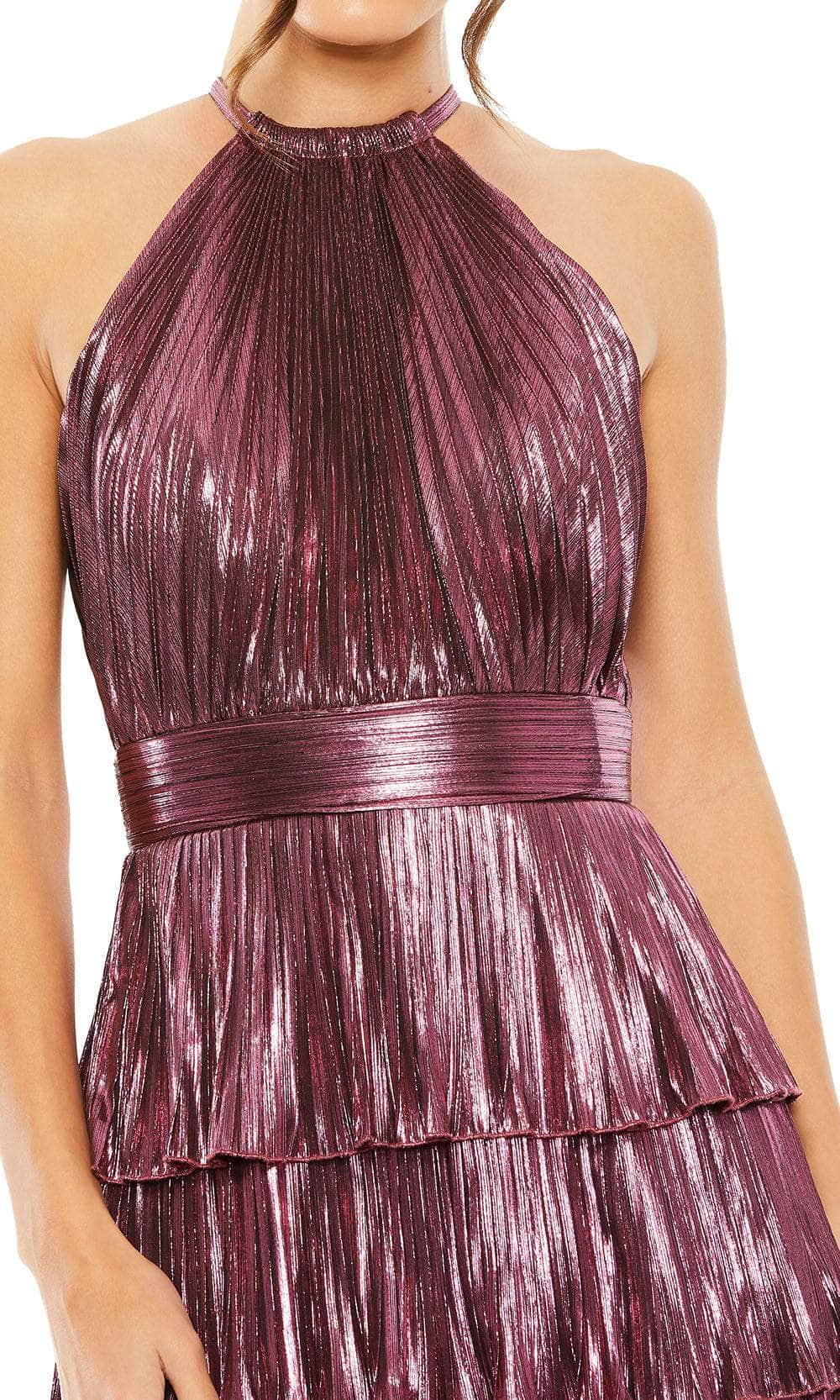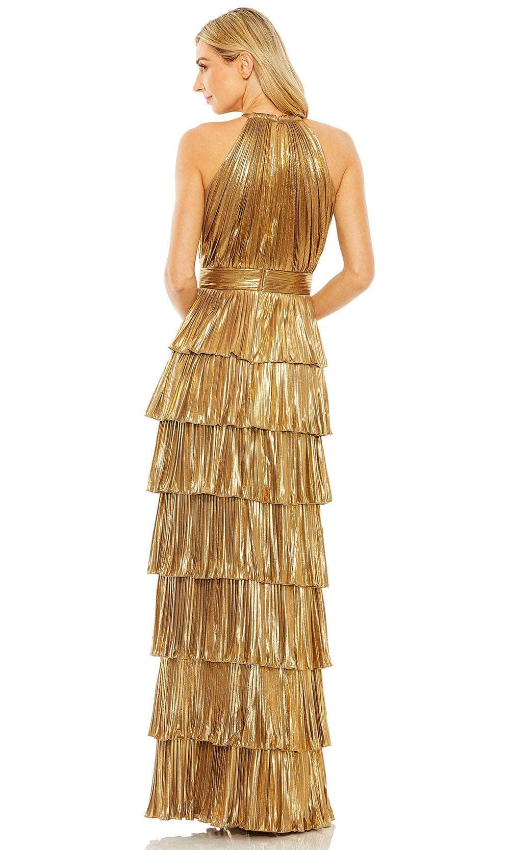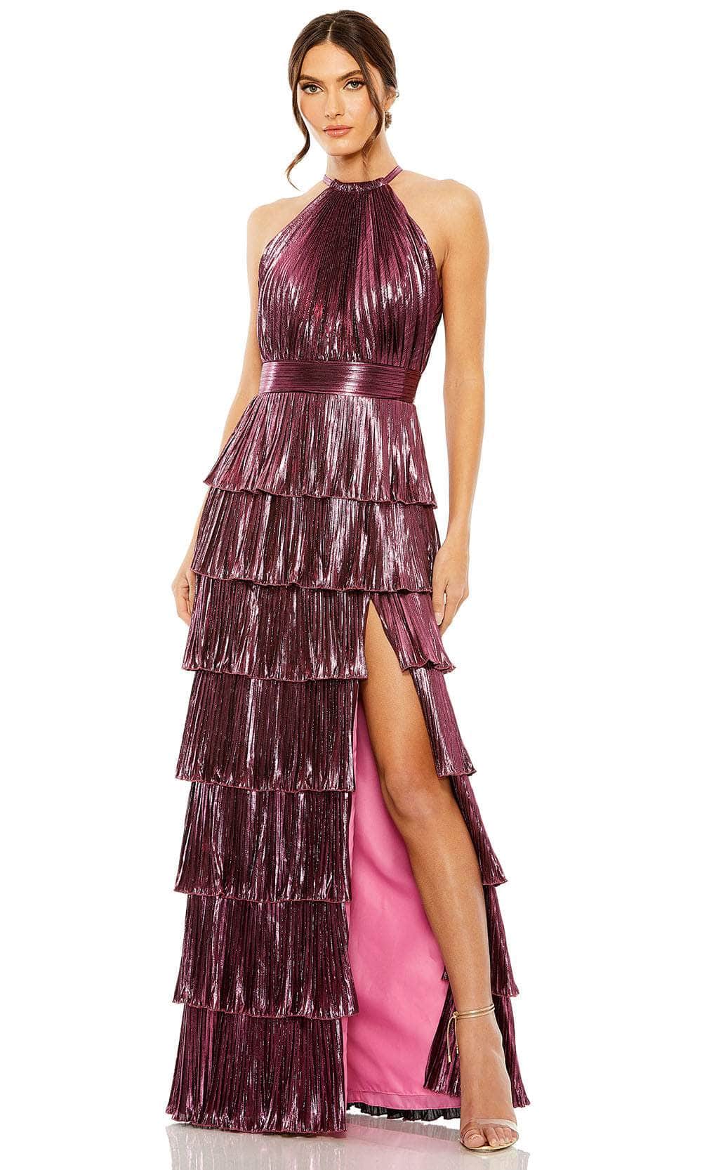 Keep your after-hours style upscale with this tailored Mac Duggal 30763 evening dress. This completely pleated creation showcases an endearing halter neckline in a sleeveless bodice. It has a full back and is secured by a zipper for a refined finish. Additionally, a high slit is emphasized on the sheath-silhouette skirt which features tiered and ruffled designs. Get glam on your next occasion in this fabulous Mac Duggal 30763 masterpiece! Models are wearing Gold, and Rose colors.