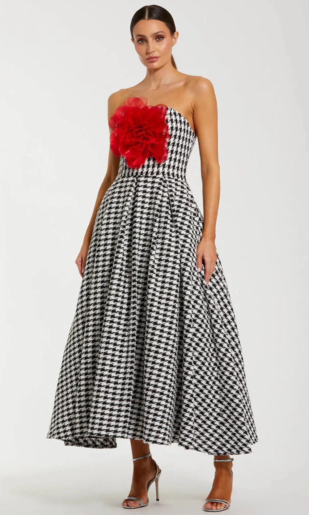 Whimsy and refinement come together in Ieena Duggal 37068 dress, designed to impress. The strapless bodice and straight across neckline highlights the shoulders, while a dimensional floral organza accent at the bust introduces artistry and charm. Functional pockets add a thoughtful detail, balancing practicality with style. A smooth lining and hidden back zipper maintain polish for the duration of wear. Textured boucle shapes the pleated A-line skirt, flowing from the natural waist and completing the look at tea length. For events where both character and elegance are desired, Ieena Duggal 37068 captures the perfect harmony. Model is wearing Black White color.