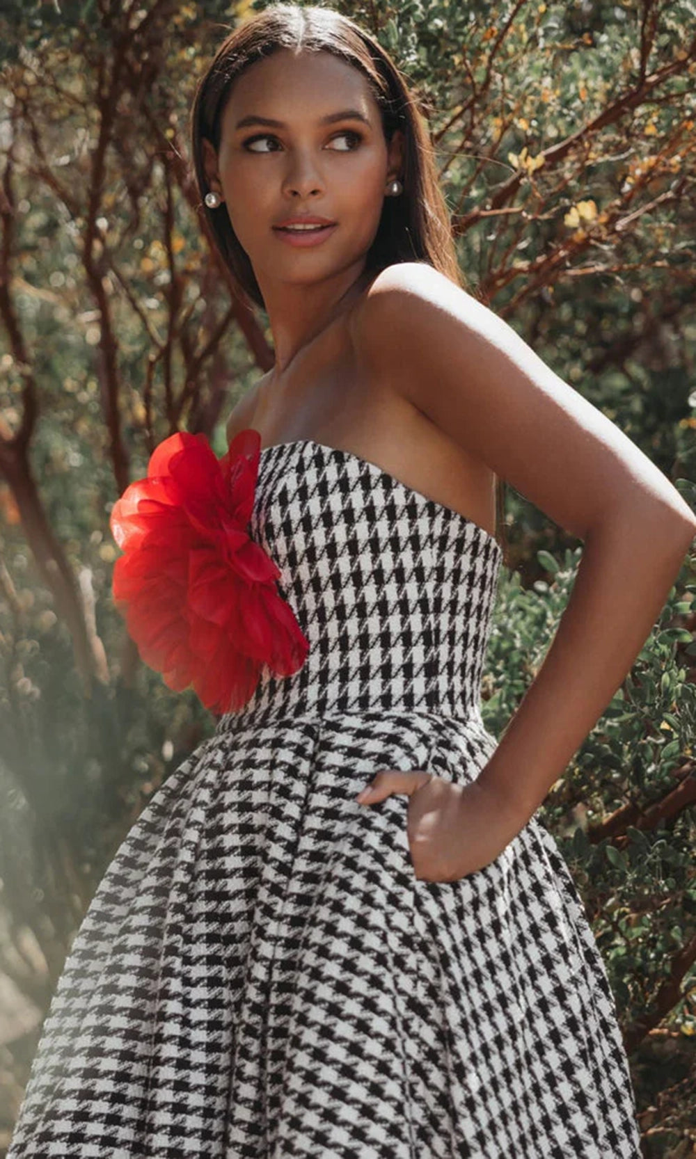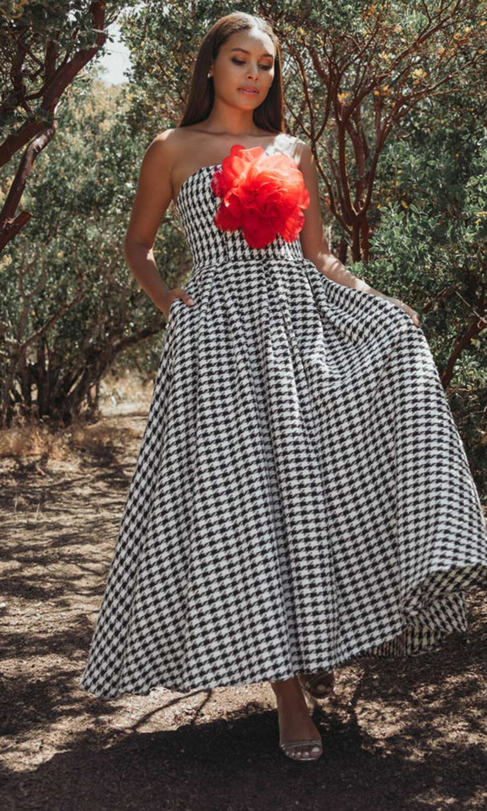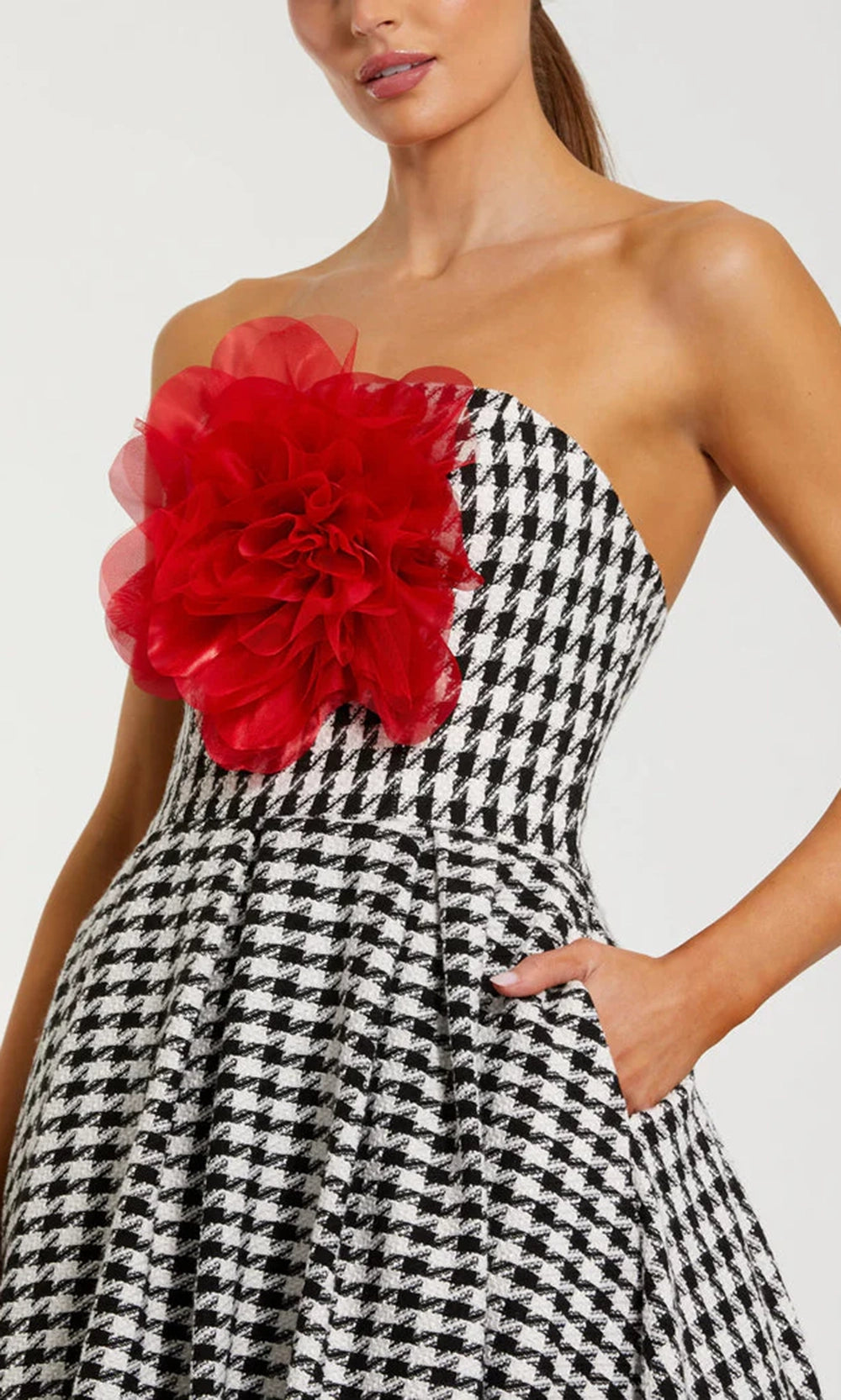 | Details: | Strapless, 3D Organza Floral, Pockets, Pleated Skirt, Concealed Back Zipper |