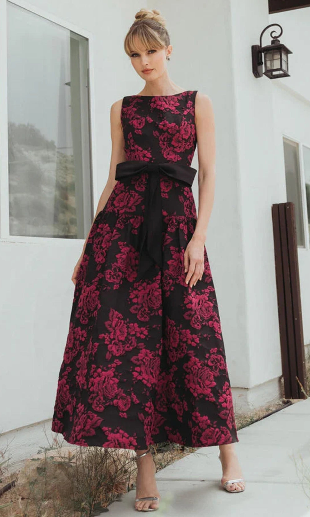 Make every occasion unforgettable with the undeniable charm of this Ieena Duggal 37091 brocade dress. The sleeveless bateau neckline emphasizes timeless refinement, while a satin waistband with a bow defines structure at the waist. A flared A-line skirt extends into tea-length, offering graceful volume and movement. Fully lined with a concealed back zipper, the dress is designed for both polish and comfort. For those seeking a piece with elegance that resonates beyond trends, Ieena Duggal 37091 is a perfect expression of sophistication. Model is wearing Magenta Multi color.