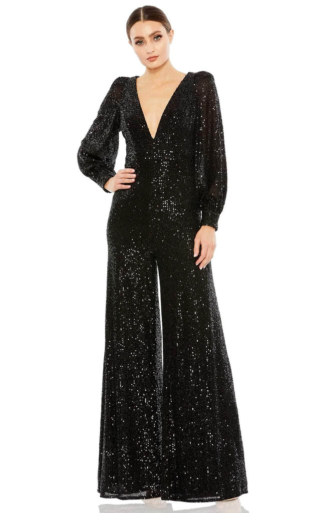 In this shimmering jumpsuit by leena Duggal 42028, get ready to dazzle everyone. Captivate the crowd with the sparkling sequin embellishments sprinkled in this fabulous piece. Long sleeves framed the plunging V-neckline and the fully enclosed back is fastened by a center zipper closure demonstrating a formal style tailored on a wrinkle-free and comfortable fabric. . Completing the look is a full-length jumpsuit pant. Wear this Ieena Duggal 42028 masterpiece for a fun, gorgeous, and sophisticated look. Models are wearing Black and Rose Gold colors.