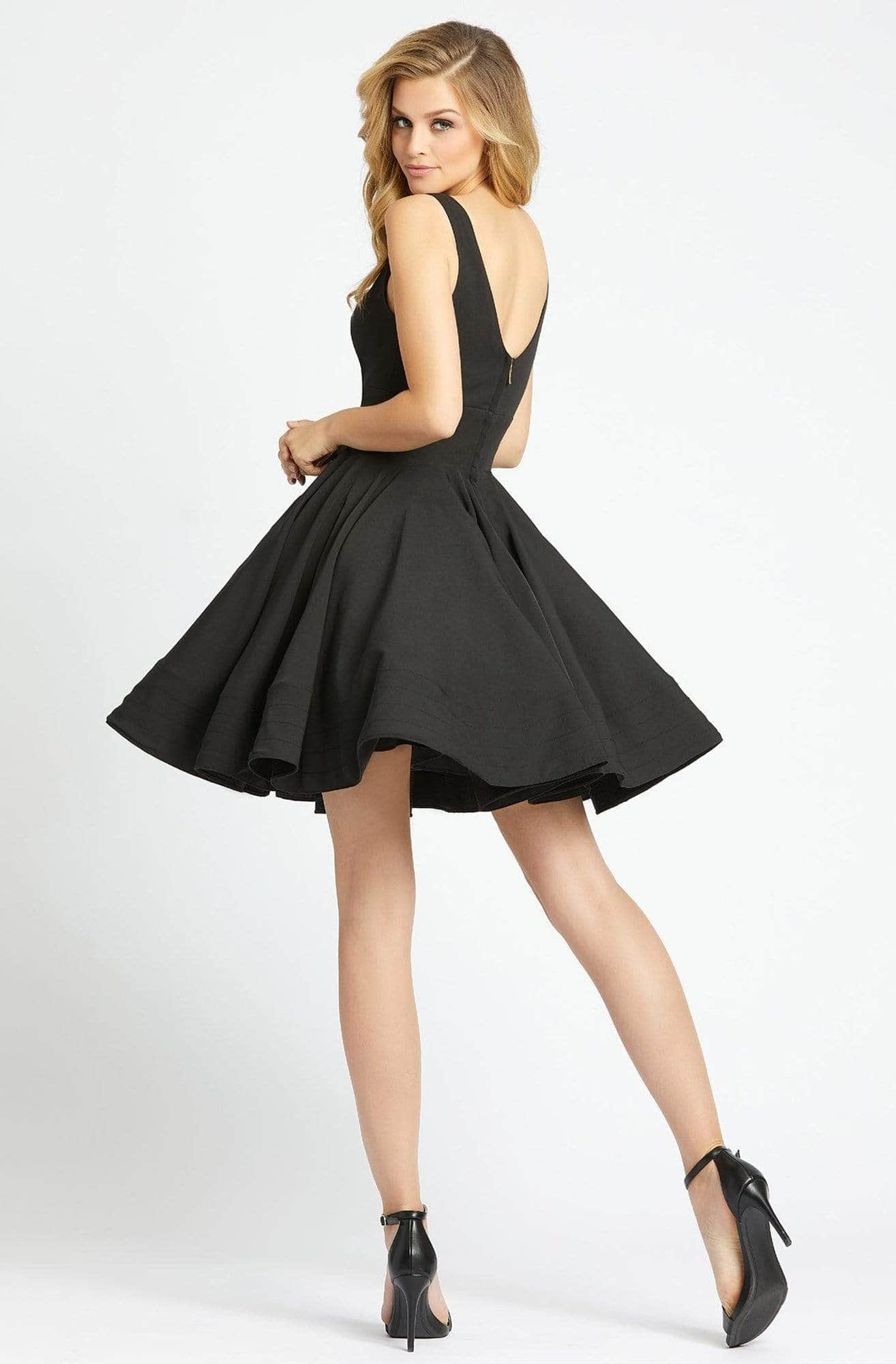 | Details: | Sleeveless, Seams, Box Pleats, V-Cut Open Back, Back Zipper Closure, Short Hem |