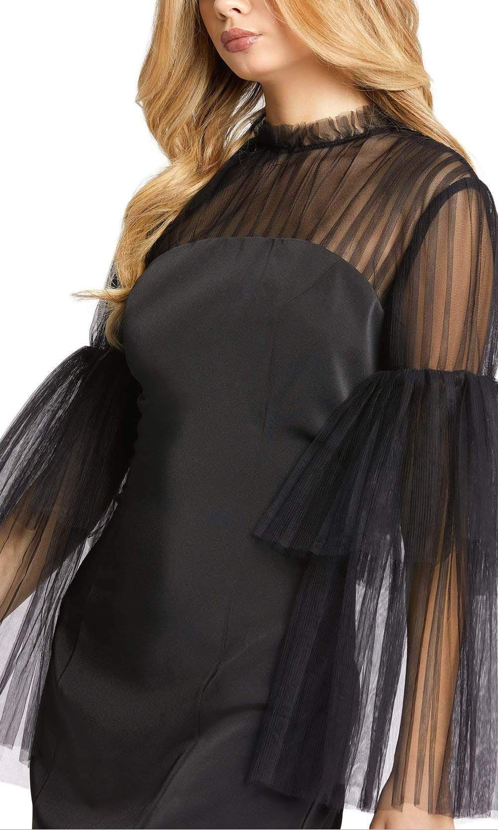 Be brilliantly stylish in this gorgeous Ieena Duggal 49118 creation. This dress is accented with ruffle accented high neckline with a sheer textured yoke. The back has a sheer design and a zipper closure. The sheer long sleeves has layered flounce. The sheath skirt skims into a short hemline. Be captivated and charmed by this Mac Duggal masterpiece.