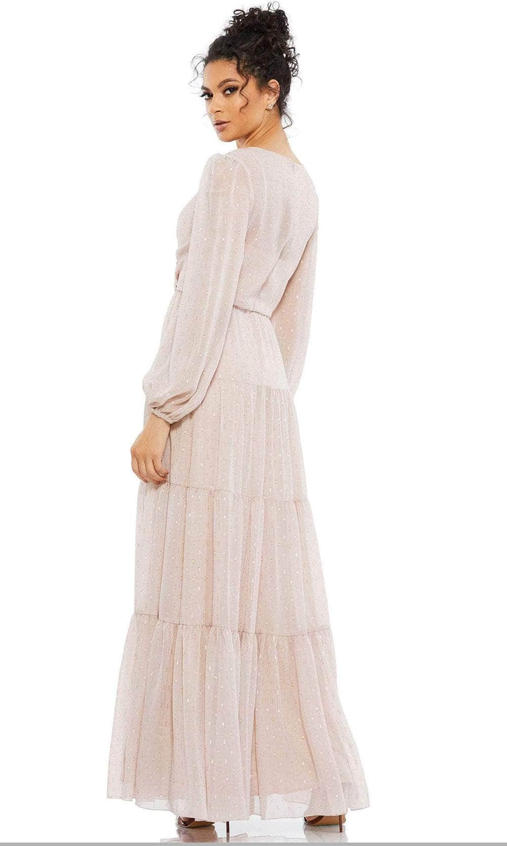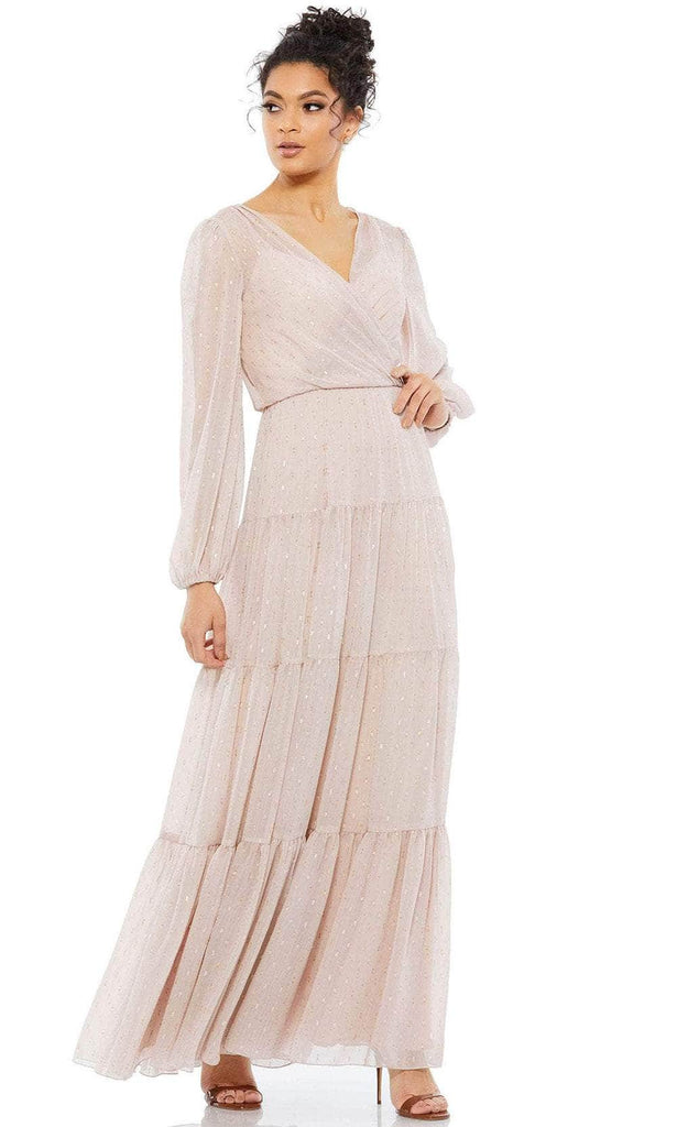 Brave the evening with temptress beauty and grace wearing Mac Duggal 49514 creation. Charms in surplice V-neckline and long bishop sleeves, this piece is beautifully ornate in glitter embellishment throughout its length. A full style with a zipper closure accents the back. The skirt showcases a tiered detail and forms a fascinating A-line silhouette that tapers in a full-length hemline. Unleash an inner glamour that attracts all eyes on you in this Mac Duggal masterpiece. Model is wearing the Blush color.