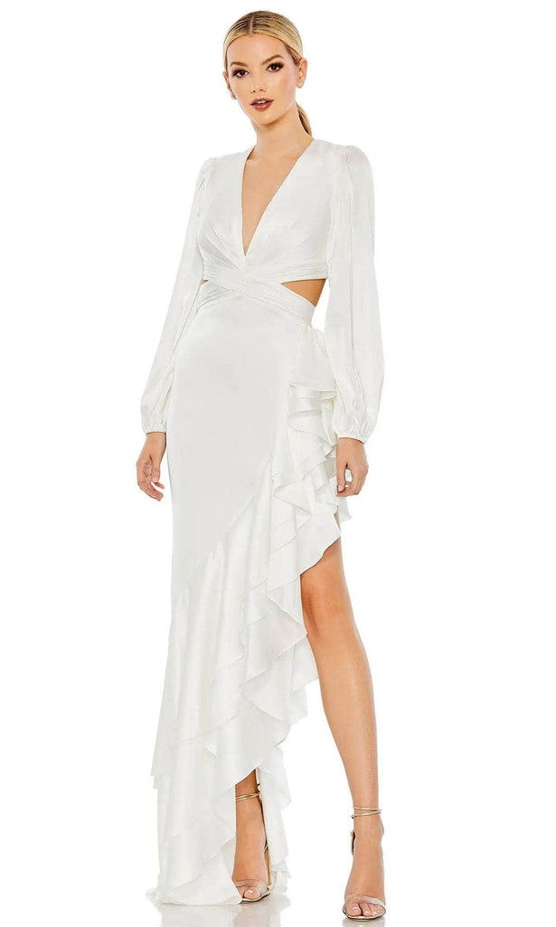 Soar to new heights of fashion in this heavenly prom gown by Ieena Duggal 49524. This form-fitting gown features a plunging v-neckline, long bishop sleeves and a pleated crisscross waist with cutouts. The back of this ensemble displays a lower cutout design and a zipper closure to keep the gown in place. A striking asymmetrical tiered ruffle is designed for the sheath skirt which cascades to the full length hem and sweeping train. Unleash an inner glamour that attracts all eyes on you in this Ieena Duggal 49524 masterpiece. Model is wearing the White color.