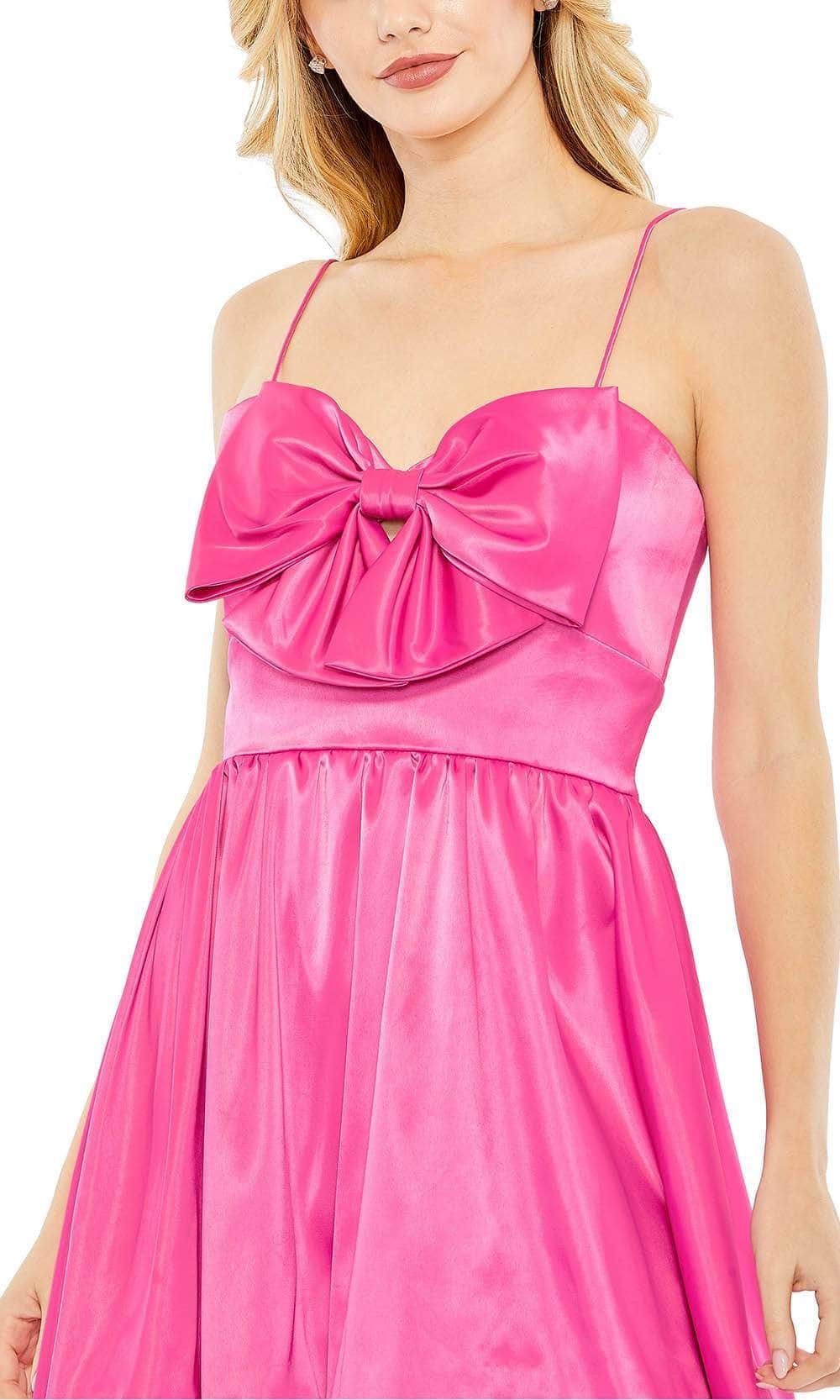 Engage the crowd while glowing with style in this romantic Ieena Duggal 49616 creation. Featuring tailoring details crafting a charmeuse silhouette, this stunner features a sweetheart neckline trailing from spaghetti straps. Accented with an oversized bow along the bust and complemented with a shirred midrise back with a cutout, the skirt softly gleams at it flares into a bubble styled design. Steal the show and catch everyone’s attention when you saunter with poise in this Ieena Duggal 49616 masterpiece. Models are wearing the Spring Green and Hot Pink colors.