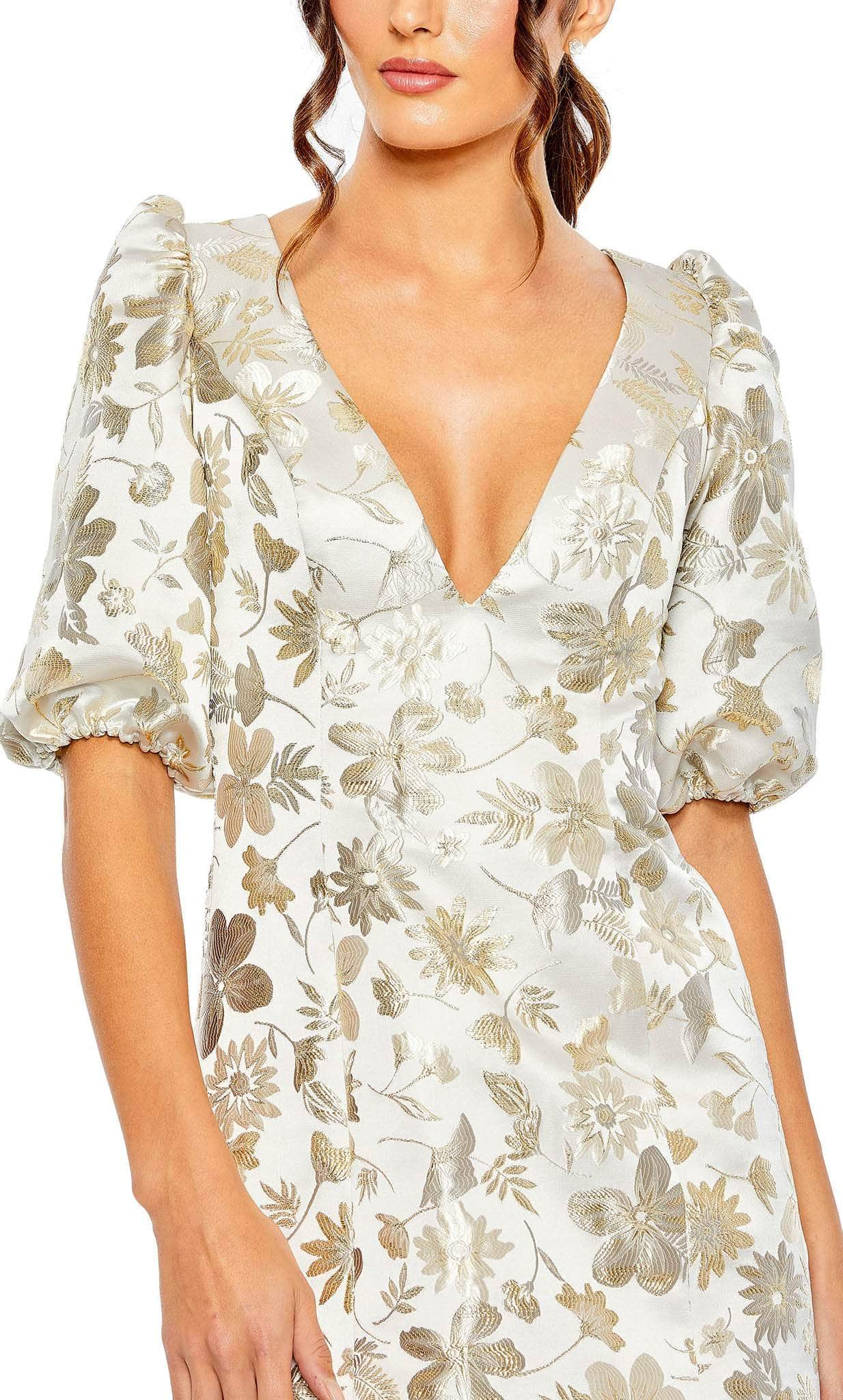 Claim that look of sophistication wearing this glamorous dress by Mac Duggal 49621. This dress is both comfortable and stylish, making it ideal for a formal afternoon event. The skirt has a lovely empire waist and falls to the middle of the thigh. This lovely floral design features puff sleeves that go just below the elbow for a feminine contrast to the deep V neckline. This Mac Duggal 49621 is specially designed to make that special occasion worth reminiscing. Model is wearing White Gold color.