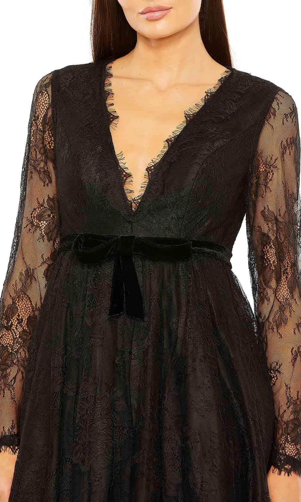 Step into a world of enchantment with Ieena Duggal 49794, a dress that combines elegance and whimsy in the most captivating way. Crafted with meticulous clean seams, this fabulous gown showcases sheer lace long sleeves that add an air of allure. The plunging V-neckline draws attention to your neckline and collarbones, leaving a lasting impression. A charming front waist bow detail adds a touch of sweetness and femininity. Embrace the magic of a babydoll silhouette, as the dress gracefully flows around you, exuding grace and charm. Dazzle and delight in this unforgettable Ieena Duggal 49794 masterpiece. Model is wearing Black color.