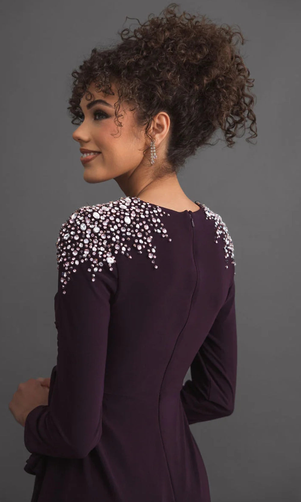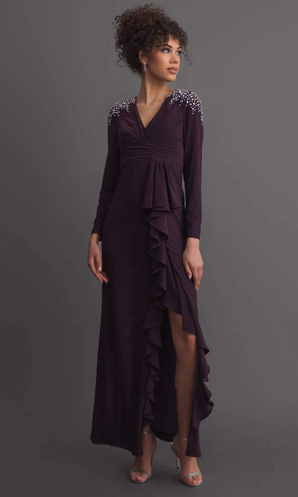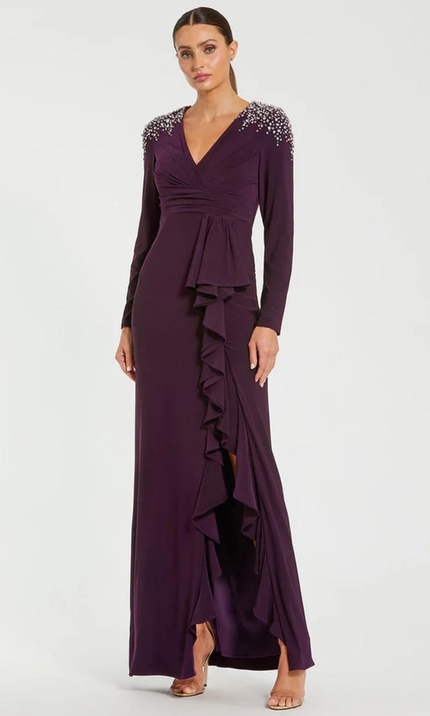 | Details: | Beaded Accent, Long Sleeves, Ruched Waist, Cascading Ruffles, Front Slit, Full Back |