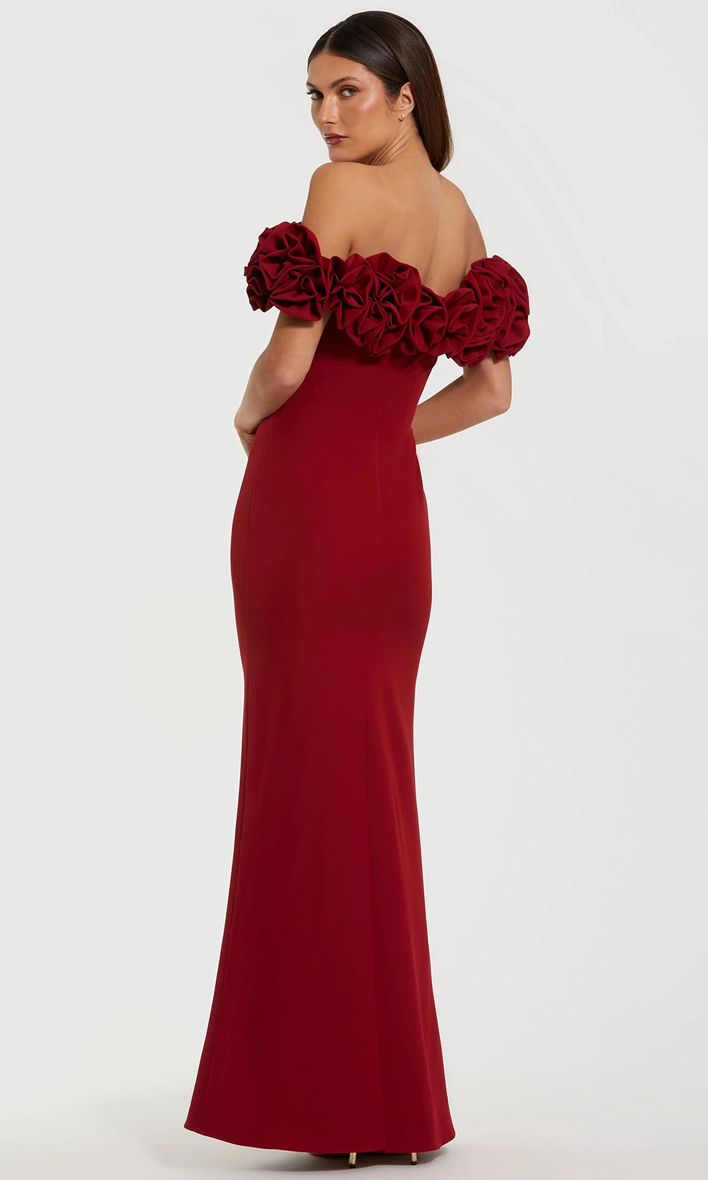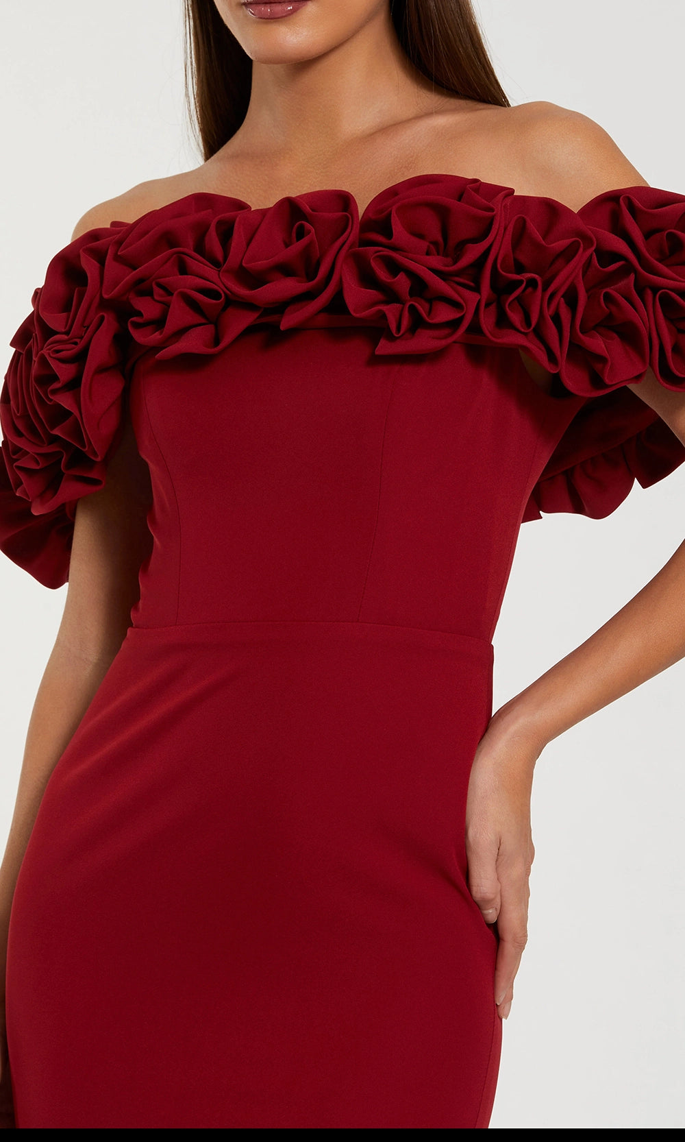 Drama and refinement meet in the Ieena Duggal 50042 design that instantly commands attention. Oversized rosettes frame the neckline with sculptural artistry, while the off shoulder cut highlights elegance. The sheath silhouette skims the figure with precision, guided by tailored seams for structure. Hidden back zipper closure and full lining ensure the gown maintains polish throughout wear. Every detail balances artistry with sophistication, resulting in a piece both distinctive and timeless. When the occasion calls for striking presence, Ieena Duggal 50042 provides an unforgettable look. Model is wearing Ruby color.