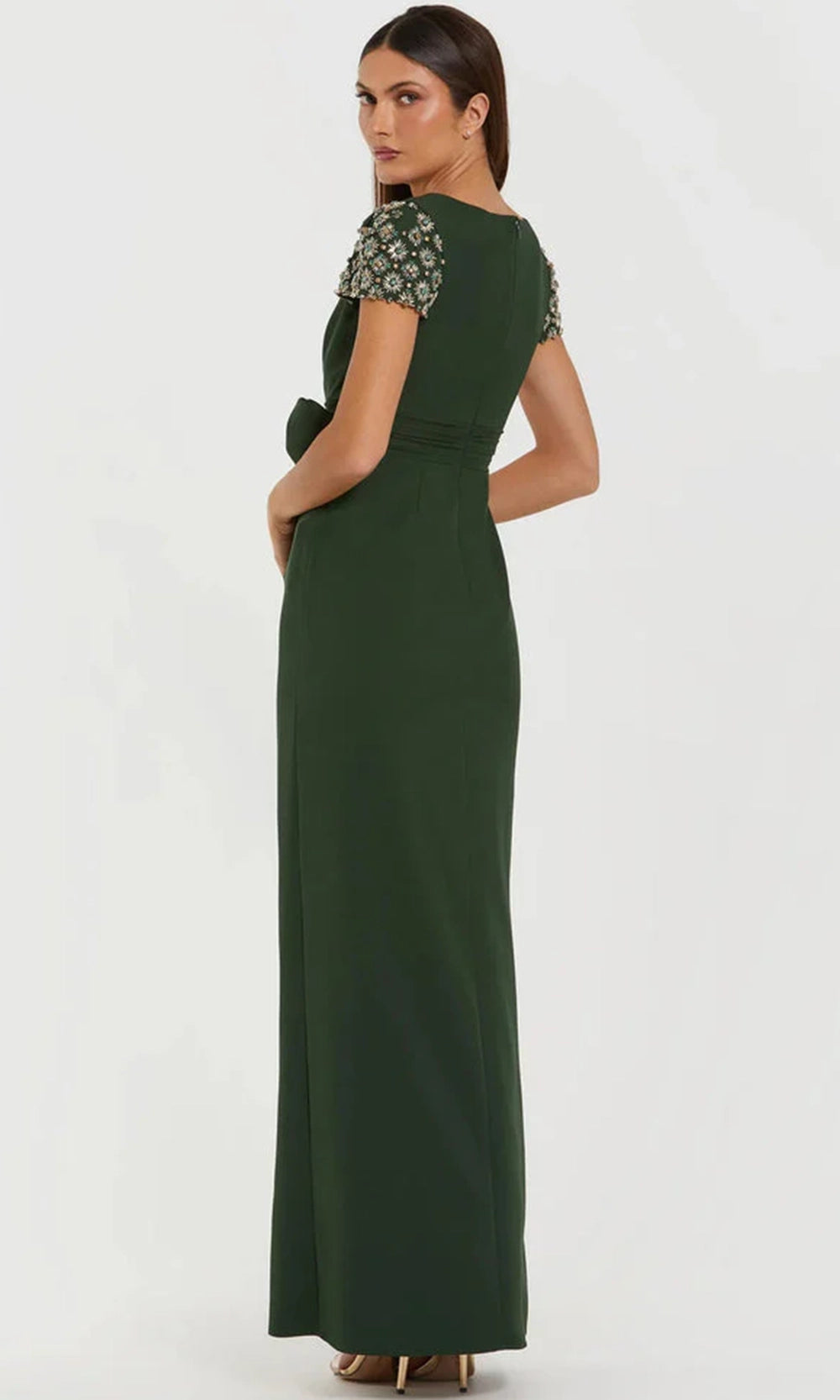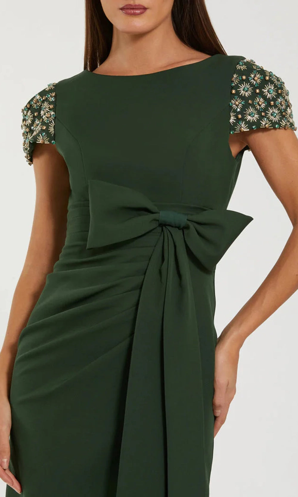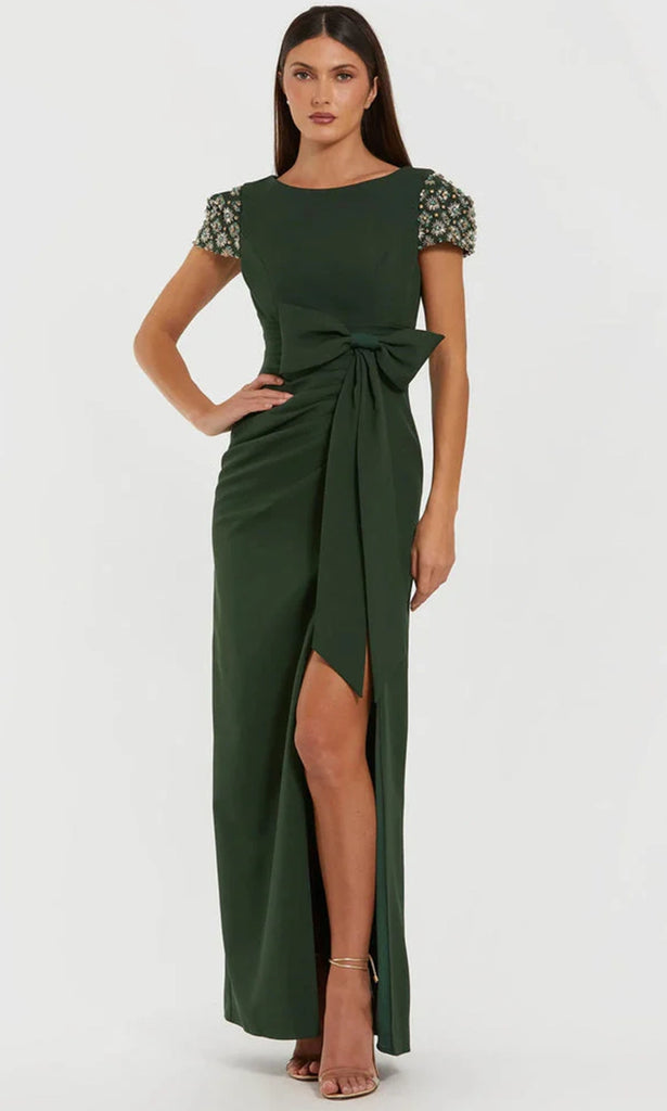 | Details: | Beaded Cap Sleeves, Oversized Bow, Front Slit, Concealed Back Zipper, Draped Waist |