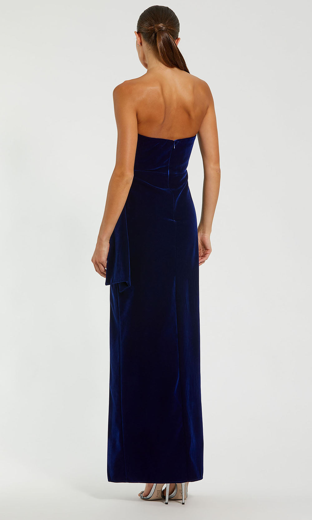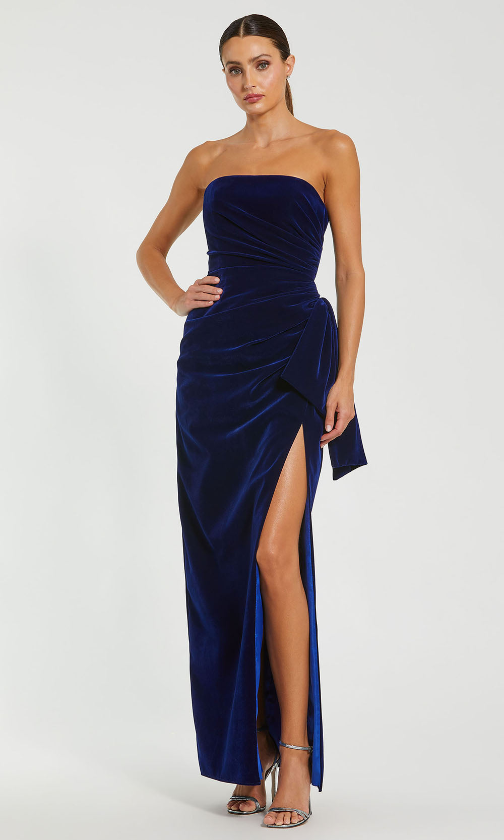 | Details: | Strapless, Draped Ruching, Thigh-High Slit, Concealed Back Zipper, Bow Accent |