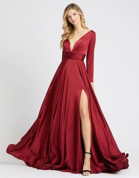 Make a classy statement at your stunning event in this Ieena Duggal 55245I creation. Exquisitely rendered in a sleek fabric, this piece shows a plunging v-neckline coupled with a full back. Defined with long sleeves and accented with ruched cummerbund, the A-line skirt opens with a high slit as it flows into a train. Look exceptional from head to toe in this Ieena Duggal masterpiece.