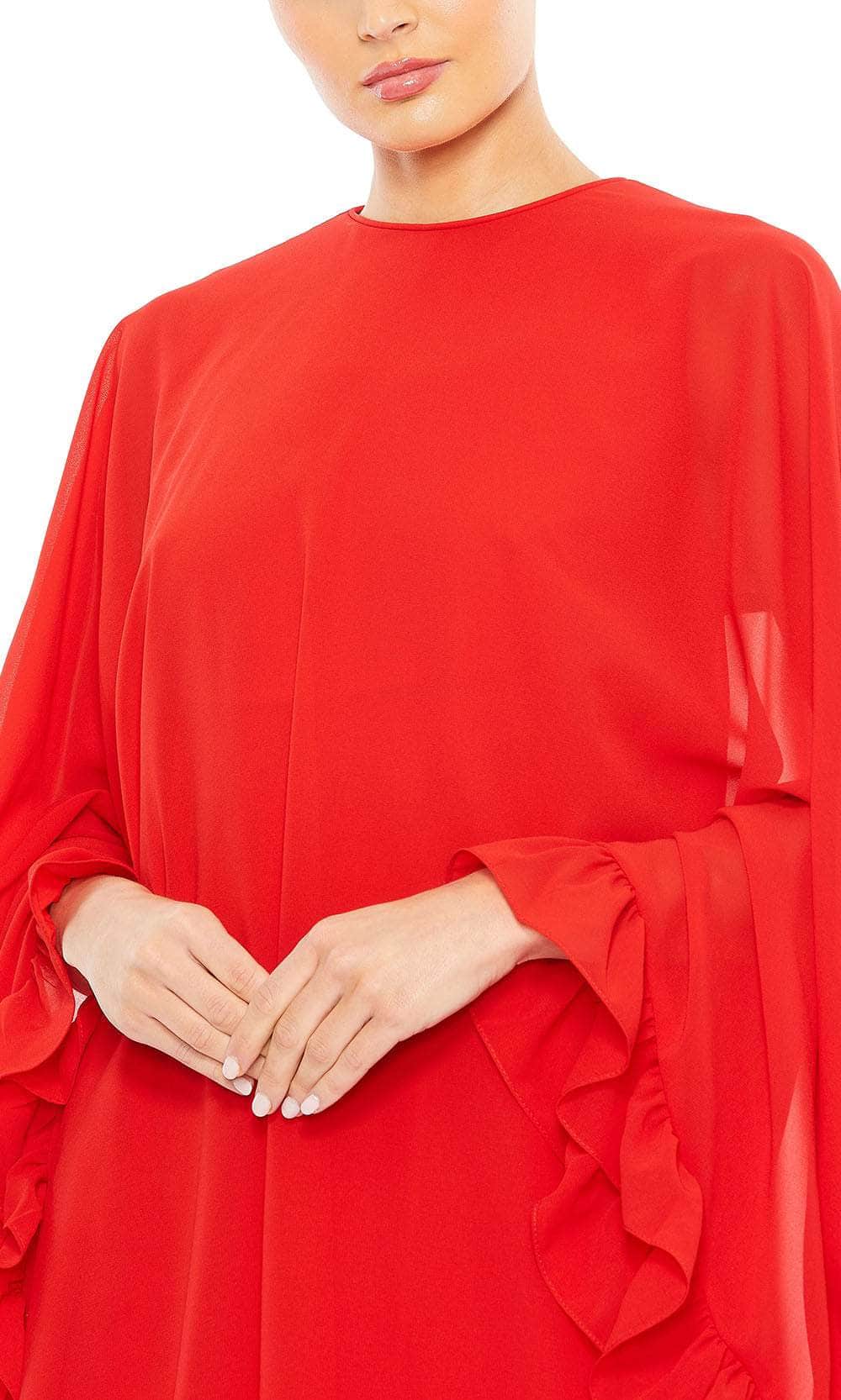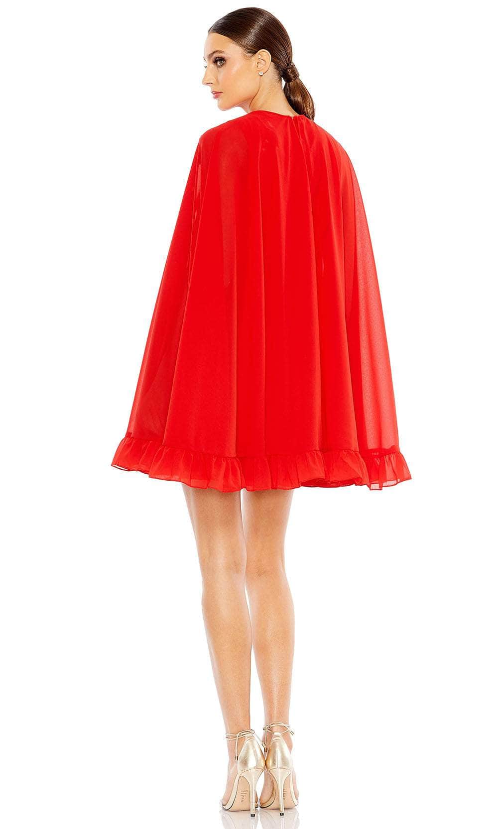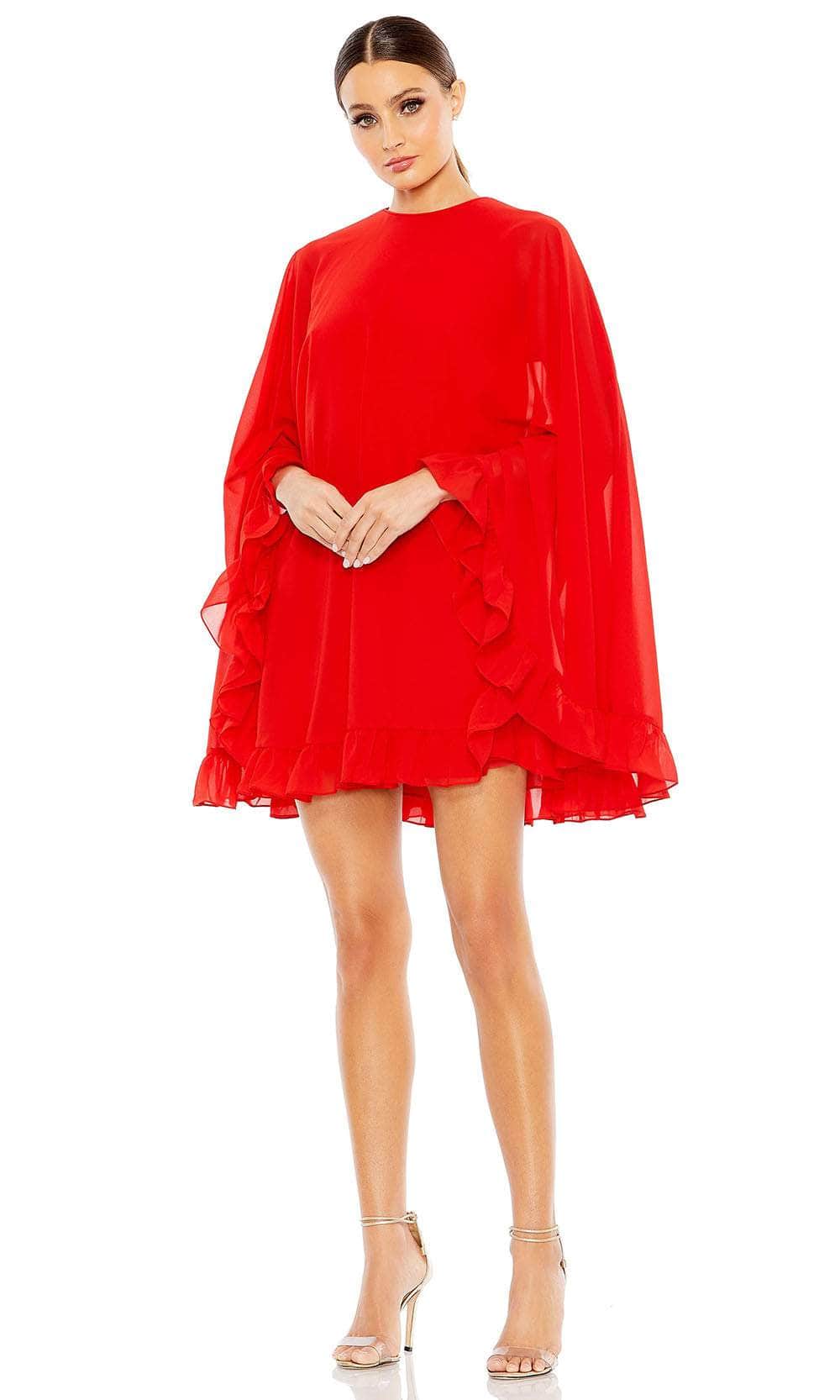 Step into sophistication with the Mac Duggal 554071 dress, a stunning piece adorned with delicate ruffle trims and chic cape sleeves. The high neckline and full back exude elegance, while the short-length skirt adds a contemporary flair. Perfect for making a stylish statement, this dress combines modern design elements with classic touches, making Mac Duggal 554071 an ideal choice for a variety of special occasions where you want to showcase your unique sense of fashion. Model is wearing Red color.