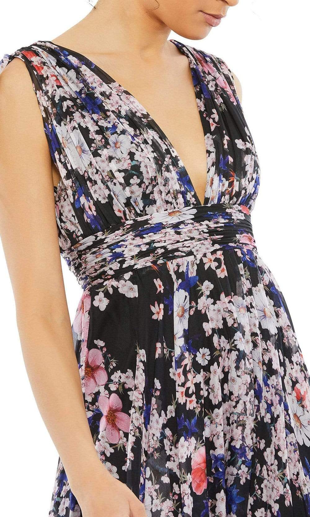 Be the delight of everyones eyes in this Ieena Duggal 55414 dress. This dress showcases a plunging V-neckline in a floral printed bodice with empire waist. Revealing an A-line silhouette, this also shows a V back with back zipper closure to complete the look. Look gorgeous as you wear this Ieena Duggal creation. Model is wearing Black and Multi-Color.