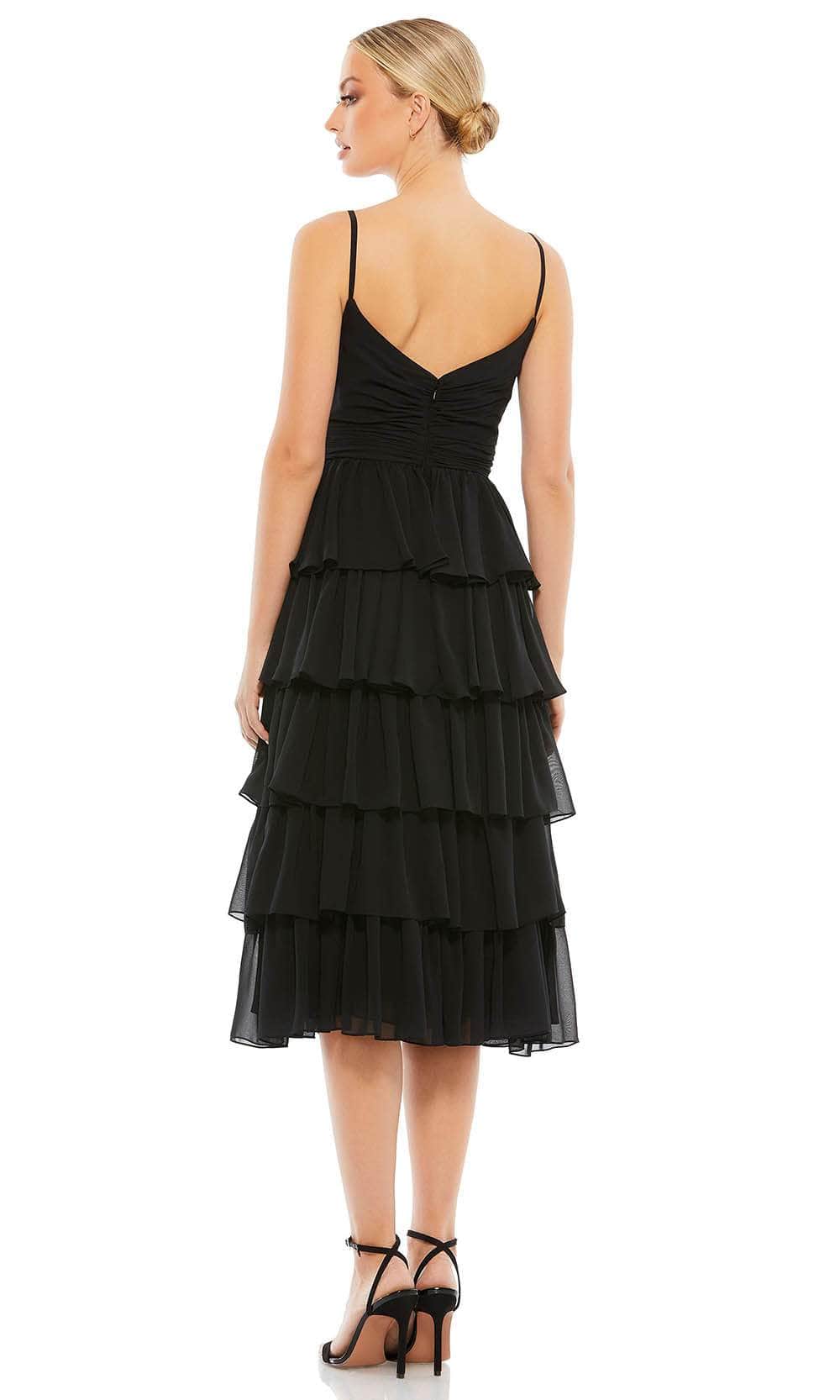 Be ready to fascinate everyone with Ieena Duggal 55437 masterpiece. Beautifully designed with ruching along the bodice, this piece features a sleeveless, V neckline and mid-open back supported by spaghetti straps. Embraced with a ruched band on the natural waist, the A-line skirt reveals a tiered ruffle detail which cascades to a tea-length hemline. Unleash an inner glamour that attracts all eyes on you in this Ieena Duggal creation. Model is wearing the Black color.