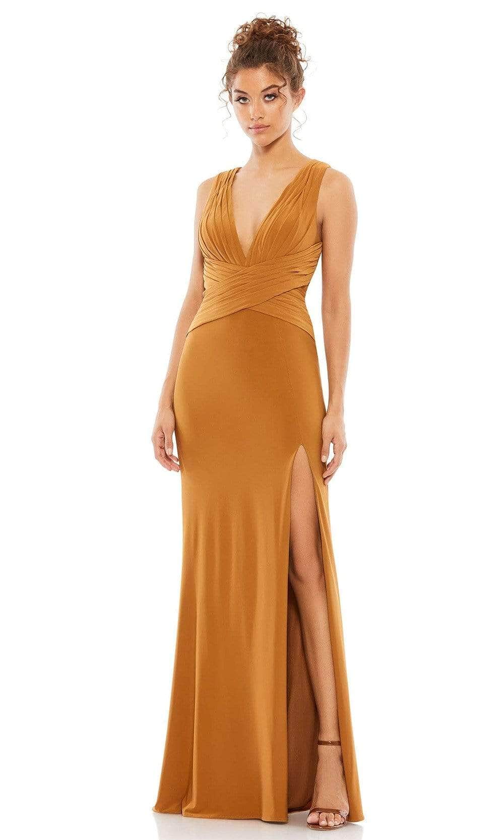 Details: Sleeveless, Plunging V-Neck, Pleated, Crisscross Bodice, High Slit, Full Back, Back Zipper