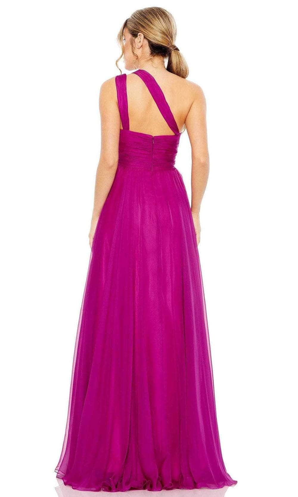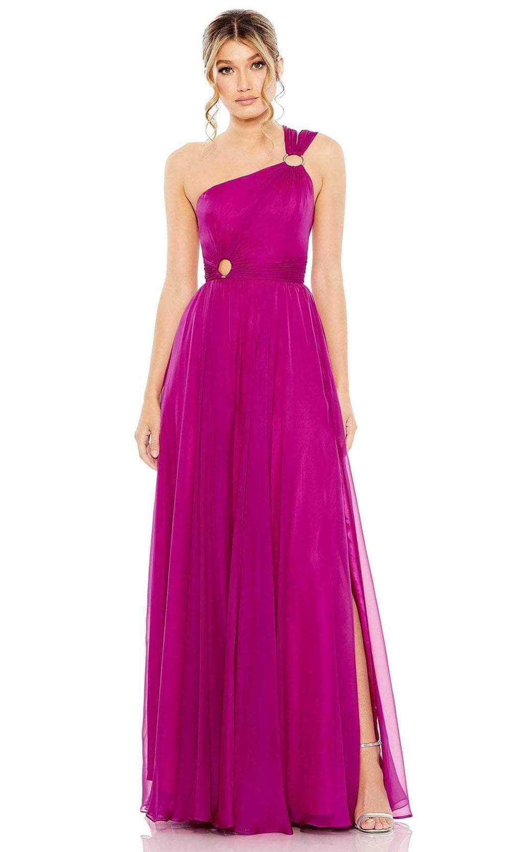 Climb the top of the best dressed list while glowing with allure in this Ieena Duggal 55820 creation. Styled in rich organza charmeuse that lavishly showcases texture with its intricate pleats, this gown features an asymmetrical neckline hanging from a circular brooch and straps that attaches to the back. Gathering at the waist and accented with a circular accent, the ethereal skirt fascinatingly flares down to the floor with a sweeping finish. Set the event on fire when you arrive in this ultra chic Ieena Duggal 55820 masterpiece. Models are wearing the Black and Magenta colors.