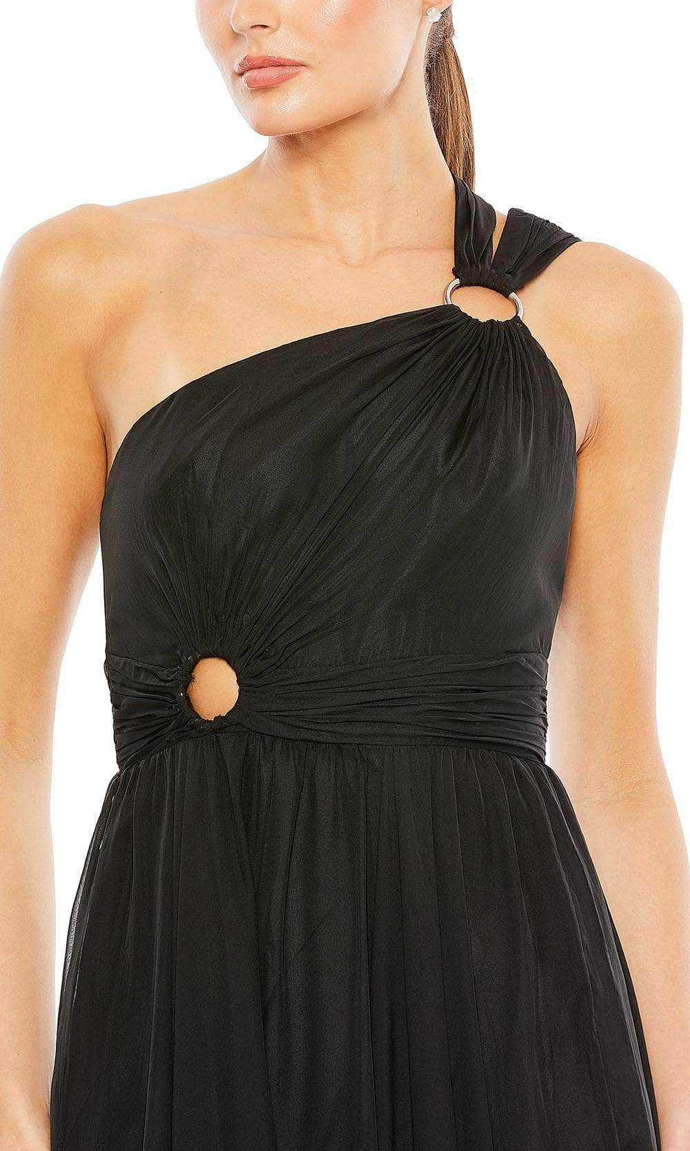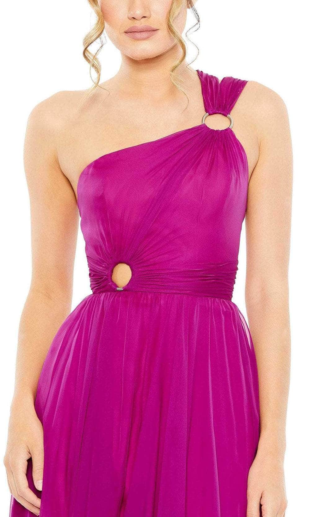 Climb the top of the best dressed list while glowing with allure in this Ieena Duggal 55820 creation. Styled in rich organza charmeuse that lavishly showcases texture with its intricate pleats, this gown features an asymmetrical neckline hanging from a circular brooch and straps that attaches to the back. Gathering at the waist and accented with a circular accent, the ethereal skirt fascinatingly flares down to the floor with a sweeping finish. Set the event on fire when you arrive in this ultra chic Ieena Duggal 55820 masterpiece. Models are wearing the Black and Magenta colors.