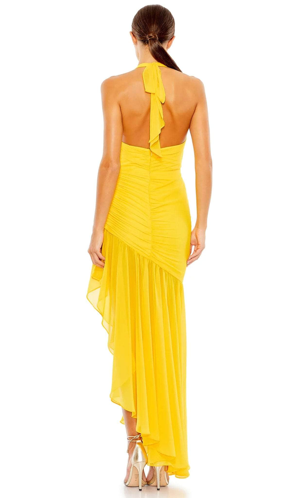 Experience an unforgettable event in Ieena Duggal 55847, a magnificent formal dress. This breathtaking piece is exquisitely tailored from chiffon fabric and includes a pleated bodice over a plunging halter neckline. the strap is tied at the back for a perfect fit. The empire waistline is emphasized by a clean seam. Reveals a gorgeous open back with a center zipper closure and the ruched detail skirt finishes in an asymmetrical high-low hem. The entirety of the bodice is fully lined and the skirt is partially lined for your comfort. This masterpiece by Ieena Duggal 55847 is undeniably captivating! Models are wearing Navy and Sunshine colors.