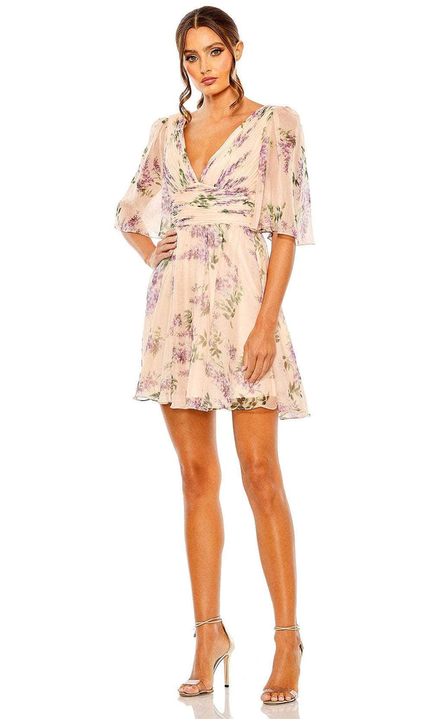 For an elegant, classic look, slip into this Ieena Duggal 55892 dress, crafted from lightweight chiffon fabric. This flatteringly-cut A-Line mini dress features a beautiful floral print, quarter sleeves, a V-neck neckline, and delicate ruffles cascading down the V-back. Ieena Duggal 55892 is a timeless piece for your wardrobe. Model is wearing the Peach Multi color.
