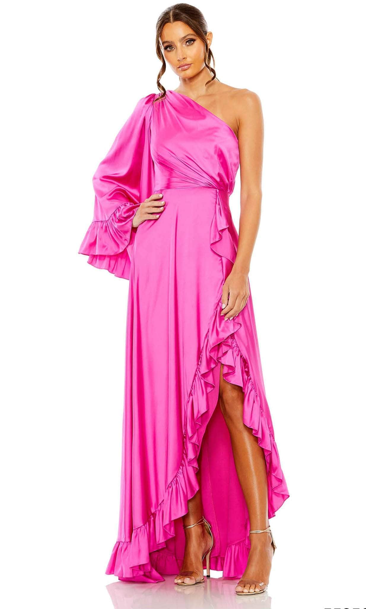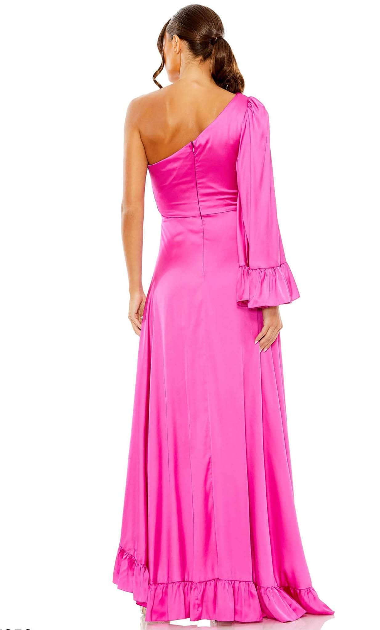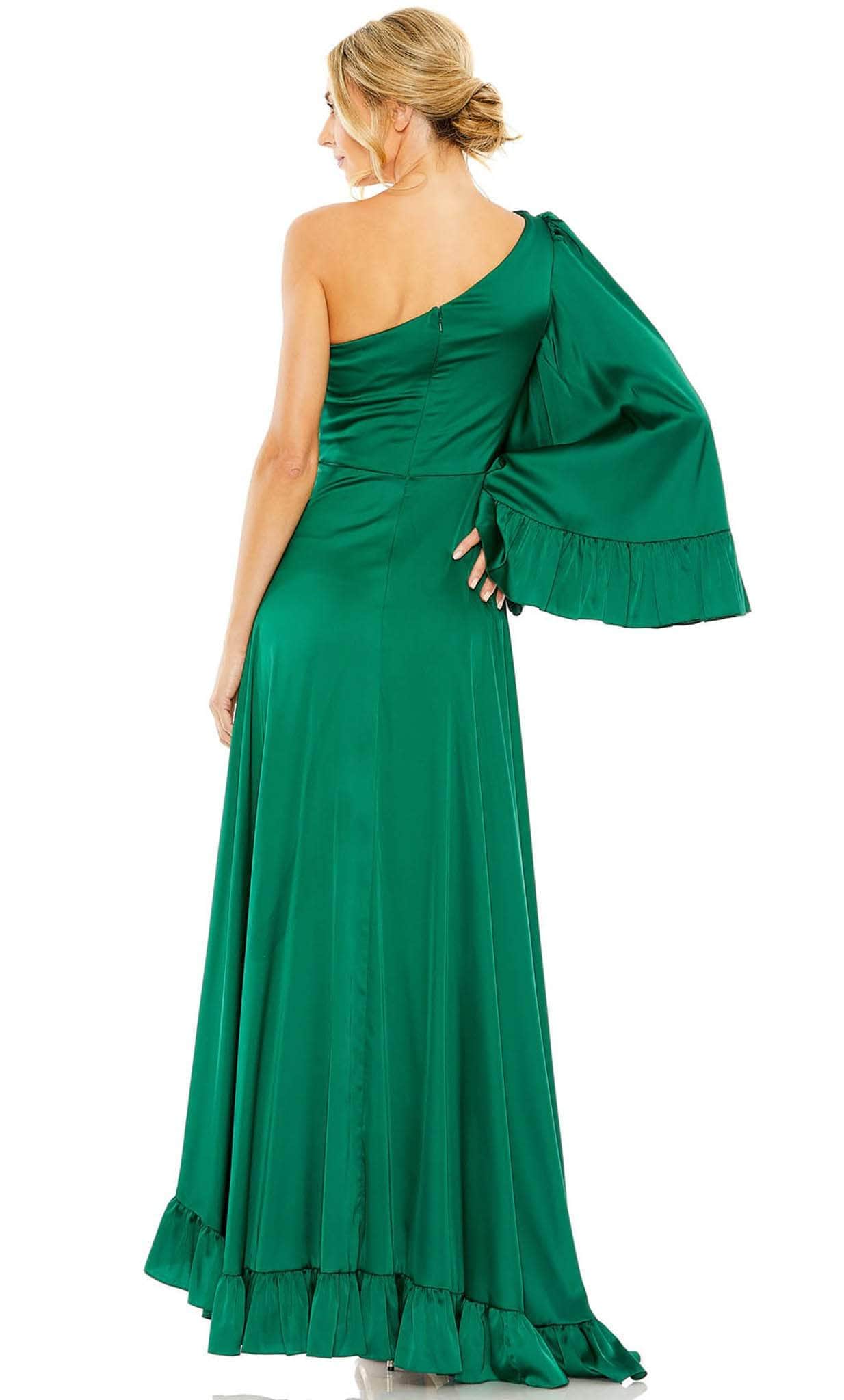 Fantasize a night of eloquent style and poise at your black-tie event Mac Duggal 55950 creation. Designed with tailoring lines on a sleek satin silhouette, this refined piece parades an asymmetrical neckline with cinched pleat details gathering atop the ruffle trimmed bell sleeve. Designed with a partial open back and a zipper closure, the A-line skirt reveals a draped high slit as ruffle trims its high low design and sweep train. Fascinate everyone with the fresh appeal and effortlessly feminine flair of this Mac Duggal masterpiece. Models are wearing the Emerald and Magenta colors.