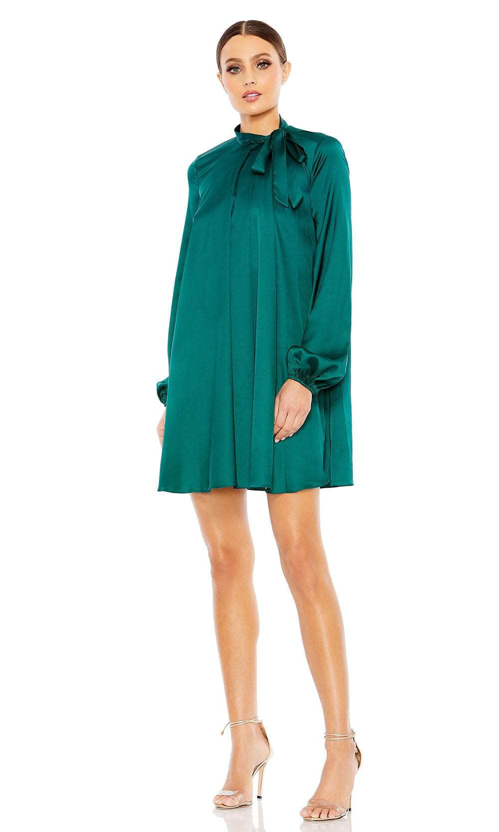 Bask in the charming beauty of this cocktail dress from Ieena Duggal 55968. This piece is made from satin fabric and exhibits a high neckline with a unique self-tie bow design. The pleated detail at the front adds texture and dimension. For excellent coverage, it also features long blouson sleeves and a fully covered back. The skirt sculpts an A-line silhouette that drapes beautifully on the body and falls to the short hemline. This Ieena Duggal 55968 masterpiece is simply captivating. Models are wearing Emerald, and Magenta colors.