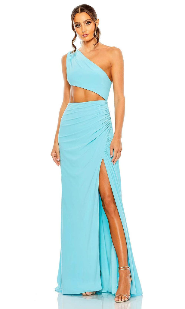 Be the lady of the night in this Ieena Duggal 55975 creation. Simple yet elegant! The sleeveless gown is crafted from jersey material and highlights the ruching details along the bodice for a figure-flattering look. It presents a matching asymmetrical neckline and midrise back, with a single wide strap for support. The cutouts design on the midriff is sure to drop jaws. On a sheath silhouette, the skirt breaks a thigh-high slit on the side and finishes with a slight sweep train. This Ieena Duggal 55975 evening gown is sure to display your natural beauty and grace. Models are wearing the Powder Blue, and Spring Green colors.