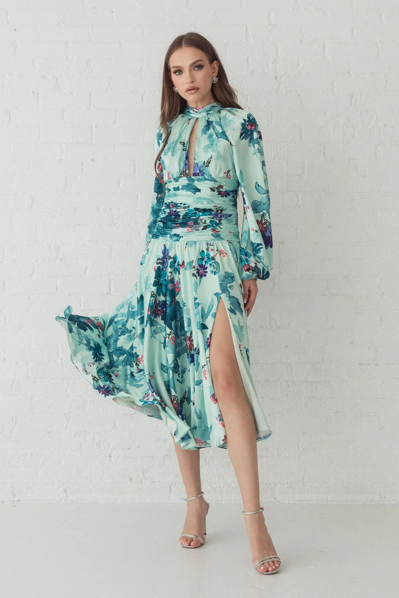 | Details: | Long Blouson Sleeves, Front Keyhole, Ruched Waistband, High Slit, Back Zipper Closure, Floral Print |