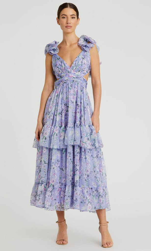 | Details: | Floral Printed, Ruffled Sleeves, Ruched, Tiered Ruffle, Lace-Up Tie, Back Zipper |