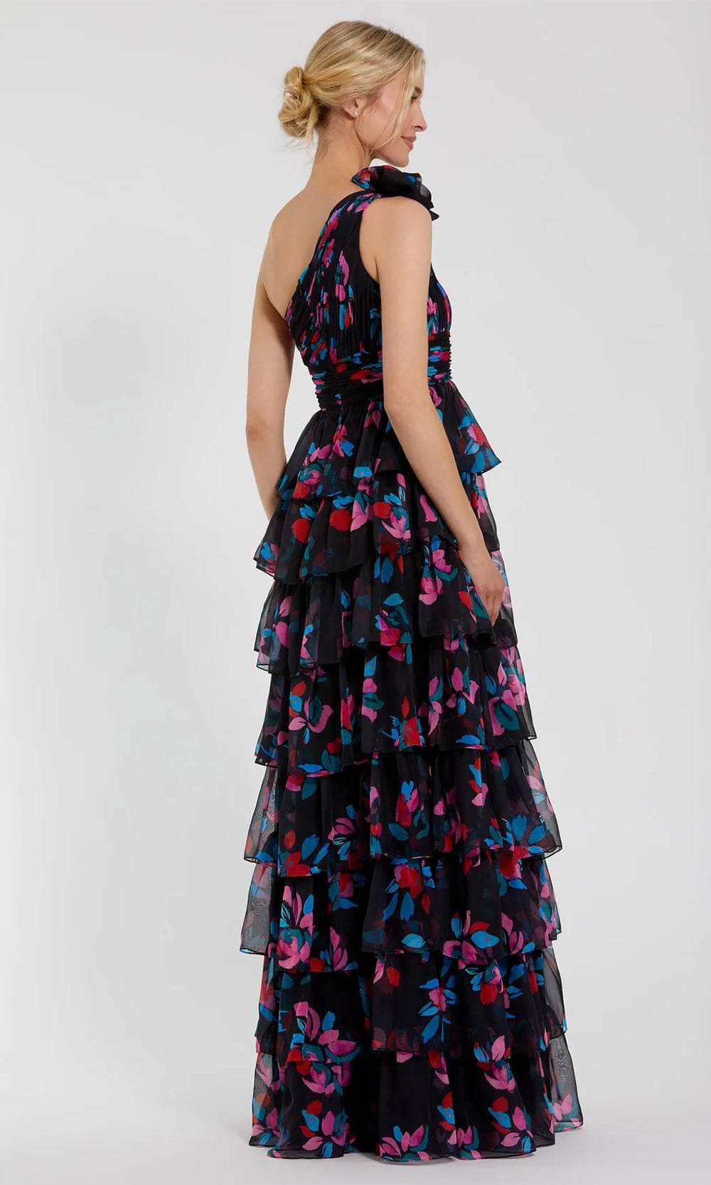You are statuesque in a posed gown from Ieena Duggal 56120, a stunning gown crafted from airy chiffon fabric. The tiered ruffle skirt and ruched bodice add a chic, sophisticated touch, while the one-shoulder neckline creates a uniquely captivating silhouette. Ideal for any special occasion, this gown effortlessly combines elegance with flair, ensuring you stand out with style and grace. The Ieena Duggal 56120 is perfect for making a memorable statement wherever you go. Model is wearing Black Multi color.