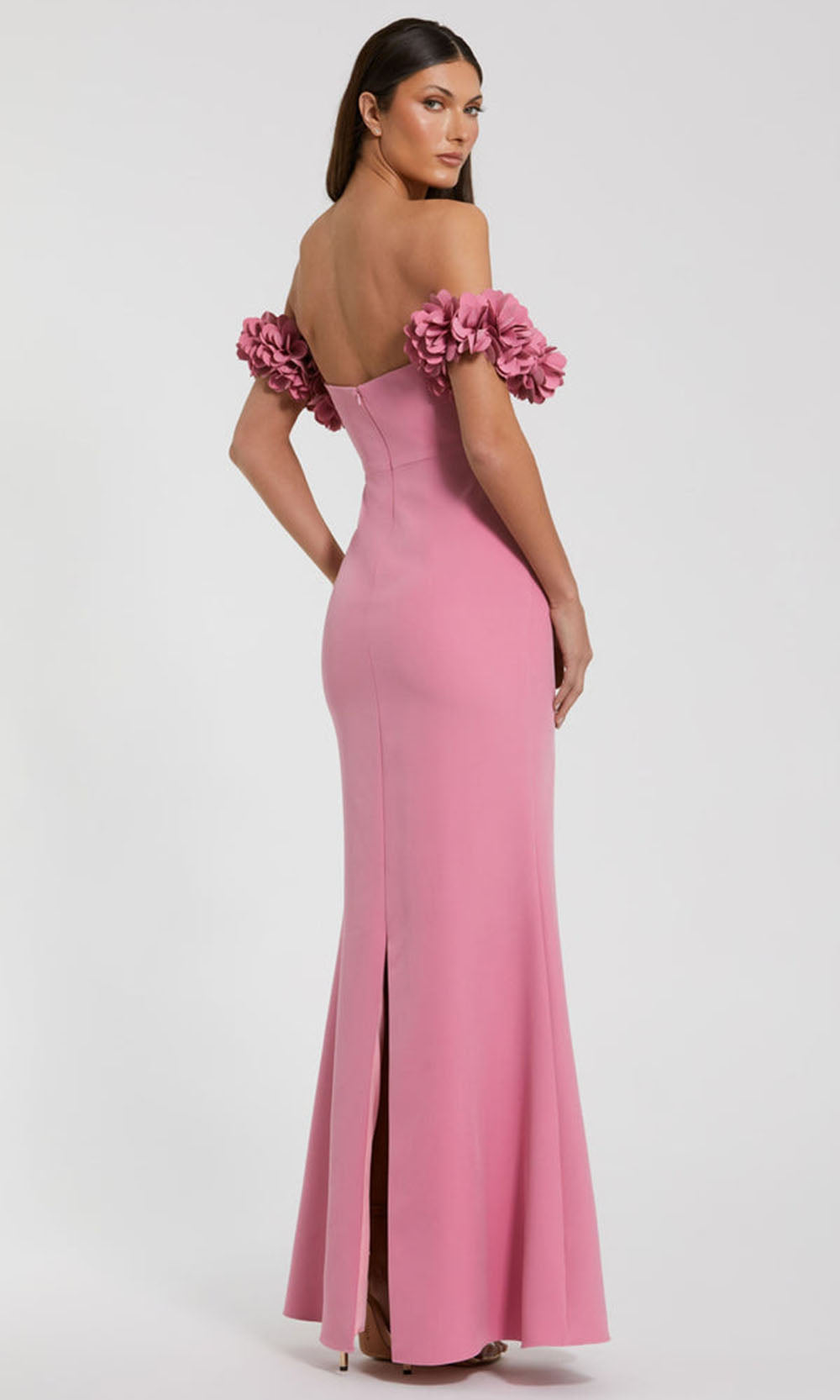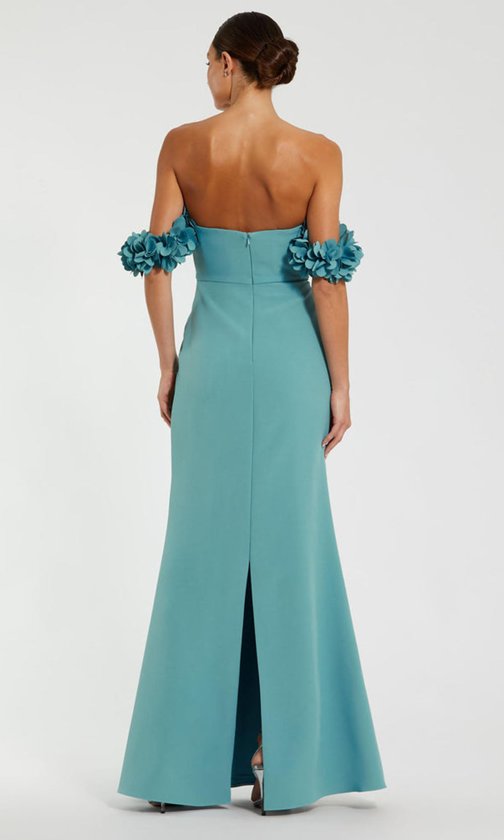 | Details: | Petal Ruffle Detailing, Off Shoulder Sleeves, Mid-Open Back, Center Back Slit, Floor Length |