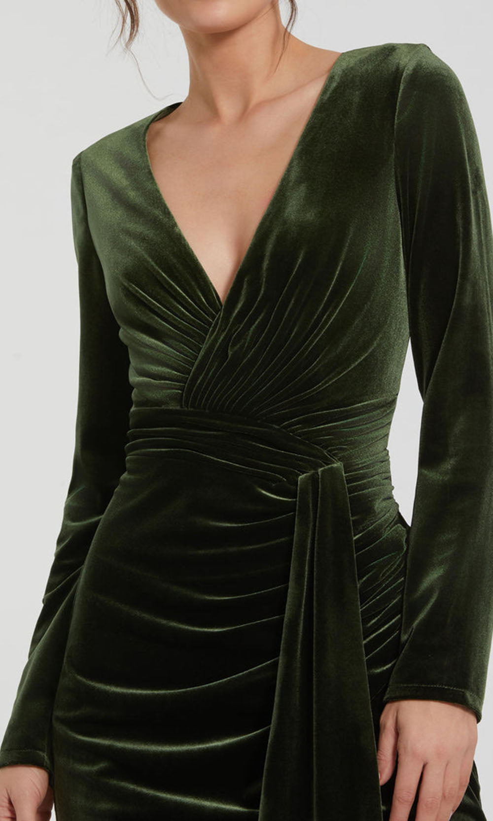 Refined drama unfolds with every step in this velvet gown, defined by the signature elegance of Ieena Duggal 56143. A surplice plunging V-neckline paired with long sleeves creates a powerful and balanced silhouette. Ruching through the waist is gathered into a flowing side sash, while a high slit adds a flash of leg for movement and allure. Poised yet bold, the Ieena Duggal 56143 full-length column gown commands attention through its thoughtful details and structured sophistication. Model is wearing Olive color.
