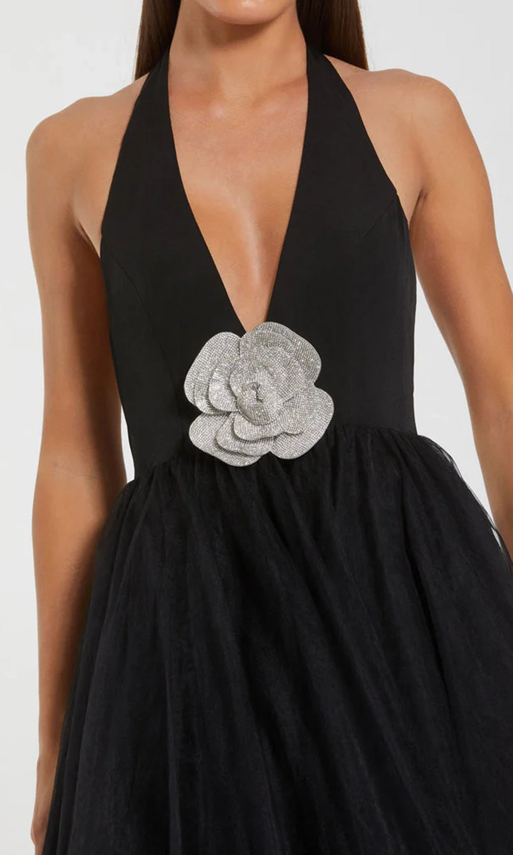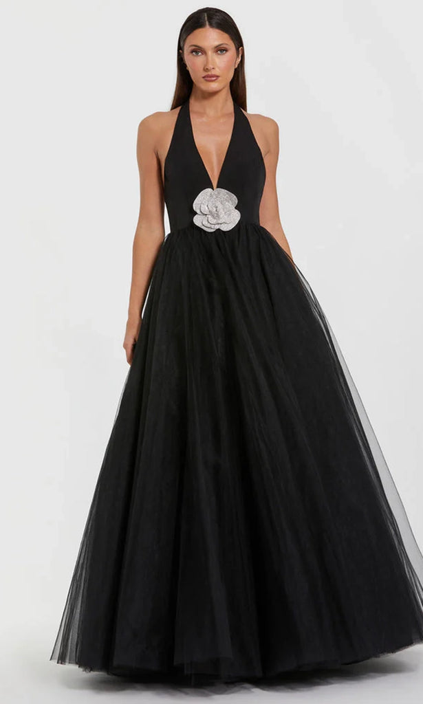 | Details: | Plunging V-Neck, Rhinestone Floral Accent, Backless, Concealed Back Zipper, Layered Skirt |