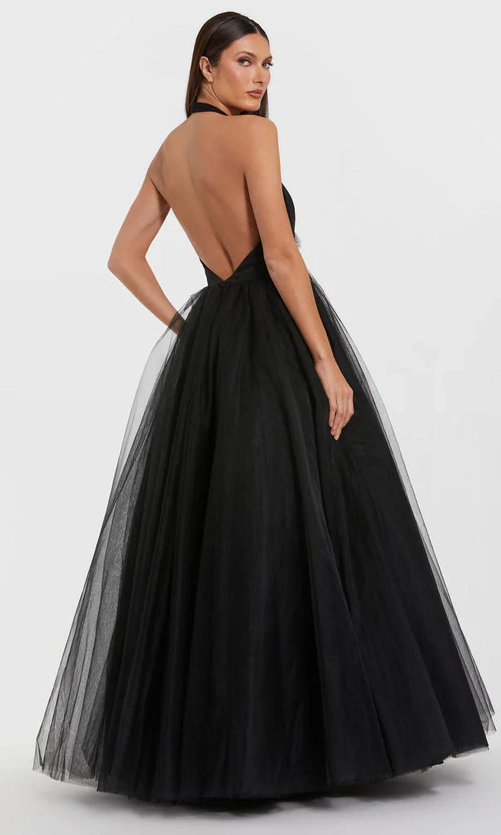 Step into evening elegance with Ieena Duggal 56187 masterpiece. With its dramatic plunging halter neckline and elegant layered skirt, the gown delivers graceful volume and detailed styling. The structured jersey top creates contrast against the airy layers of tulle in the ballgown skirt. A rhinestone floral embellishment at the waistline draws attention to your natural shape, while the backless design enhances the gown allure. Fully lined and expertly finished, this Ieena Duggal 56187 style is ideal for upscale occasions. Model is wearing Black color.