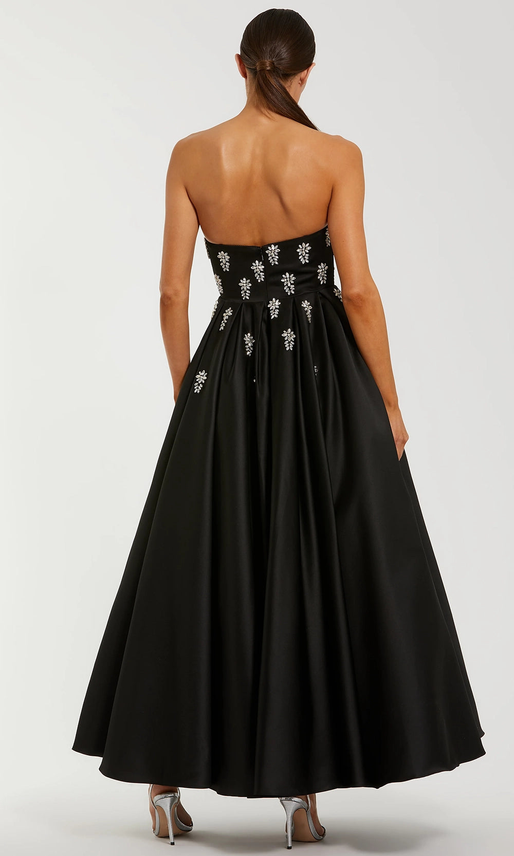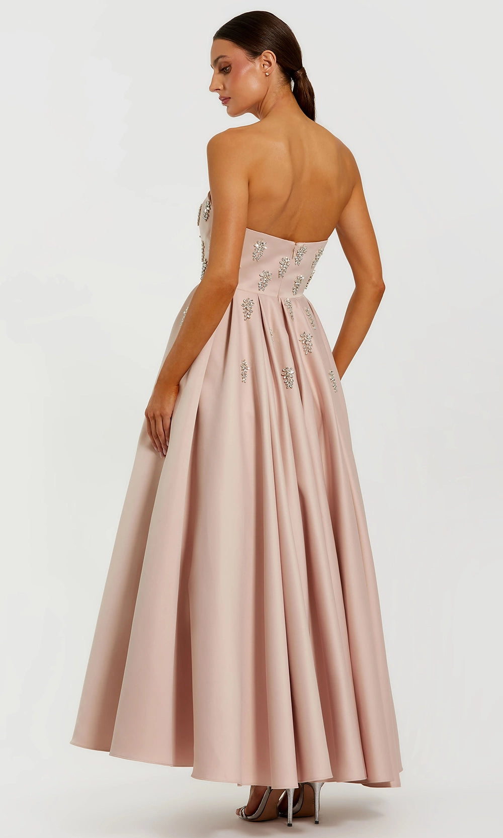 | Details: | Crystal Applique, Strapless, Pockets, Concealed Back Zipper, Pleated Skirt |