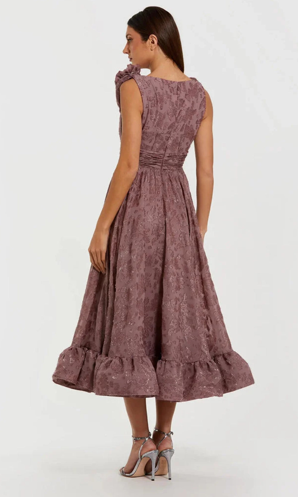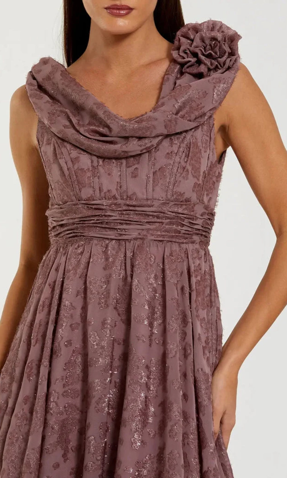 Vintage-inspired charm takes the spotlight in this Ieena Duggal 56223 romantic A-line dress with layered texture and graceful flow. It showcases a soft cowl neckline that drapes gently around the collarbone, while a dimensional floral applique adds a focal point to one shoulder. The ruched waistband cinches the figure before the skirt flares into a playful ruffled tea-length hem. Made from burnout chiffon, fully lined, and finished with a back zipper, the Ieena Duggal 56223 brings elegant softness with a distinct personality. Model is wearing Mauve color.