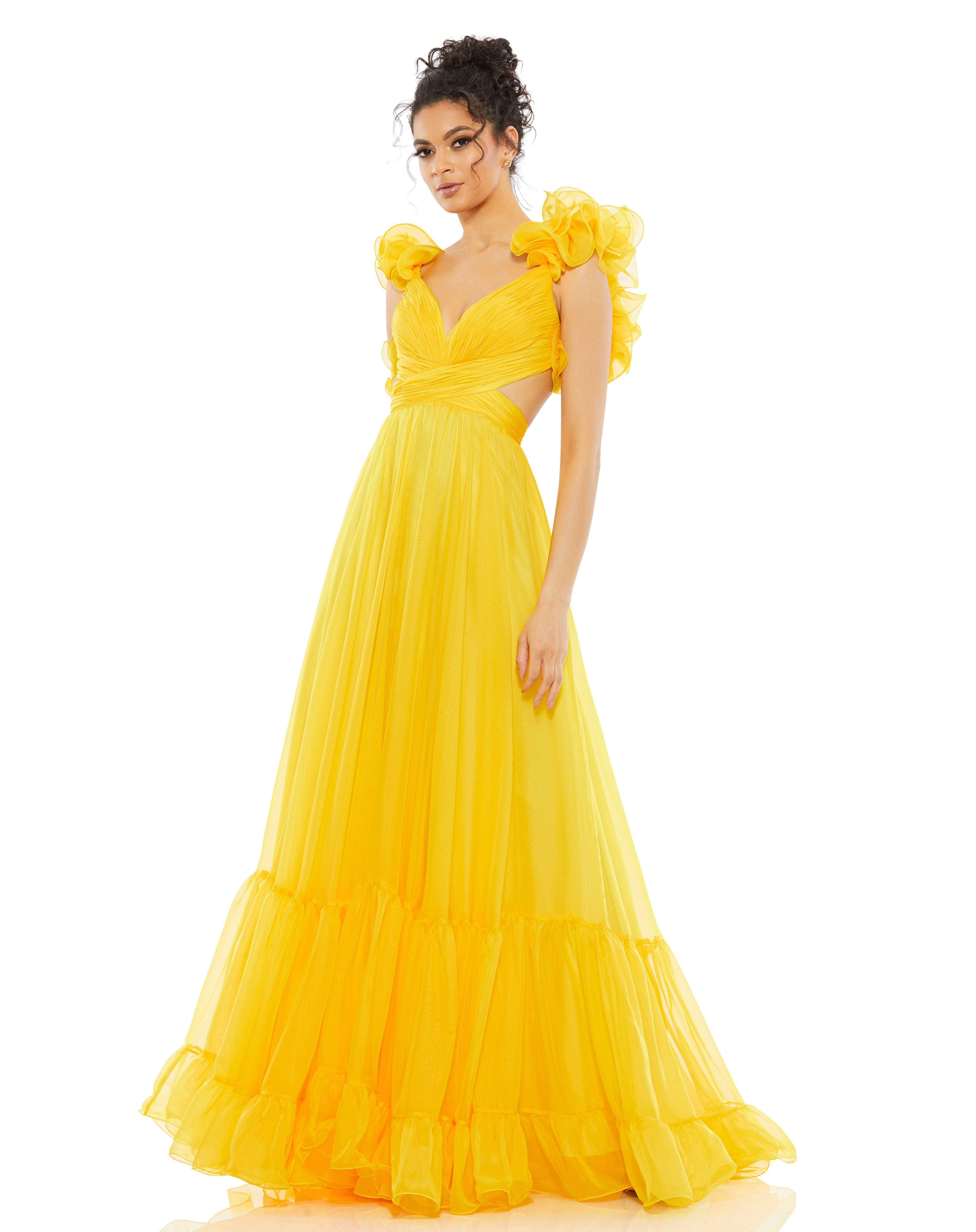 Flourish a romantic flair as you walk down the red carpet in this Ieena Duggal 67911 creation. Festooned with thick ruffle details on the shoulders, this dress parades a v-neckline on a pleat ornate bodice. Side cutouts accent the midriff as a lace up detail nips the back. Flaunting a crisscross waist design, the tiered skirt streams into a fluttering finish with a train. Impress everyone with the sophistication on this Mac Duggal masterpiece.